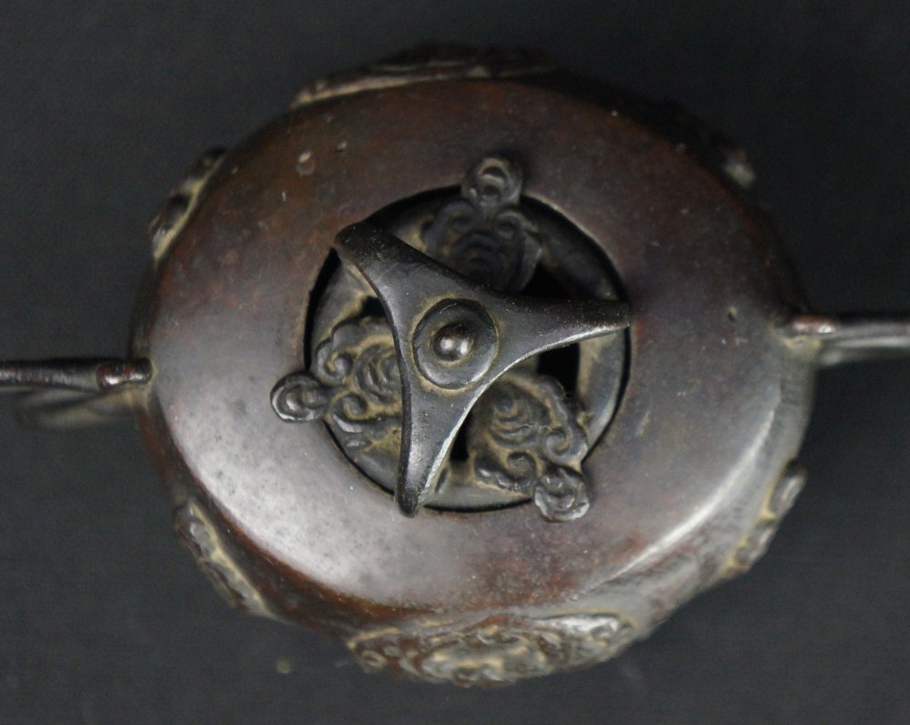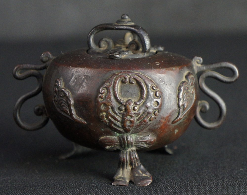 Japanese incense burner Koro solid bronze lost wax technique, decorated with Komori bat motif. Nice craft, some wear from long usage and time, old restoration on one leg, immediately usable.