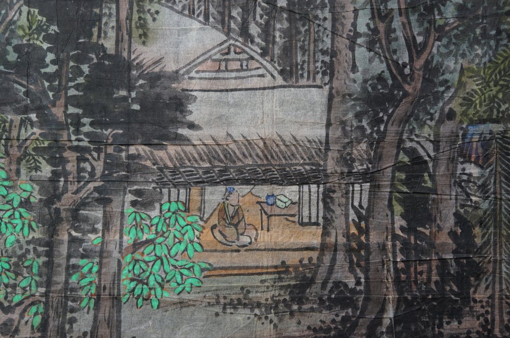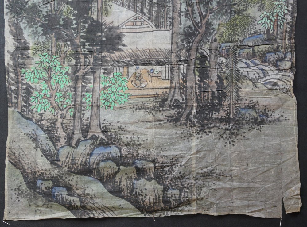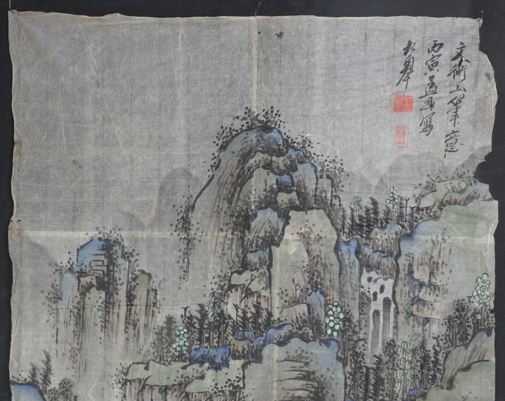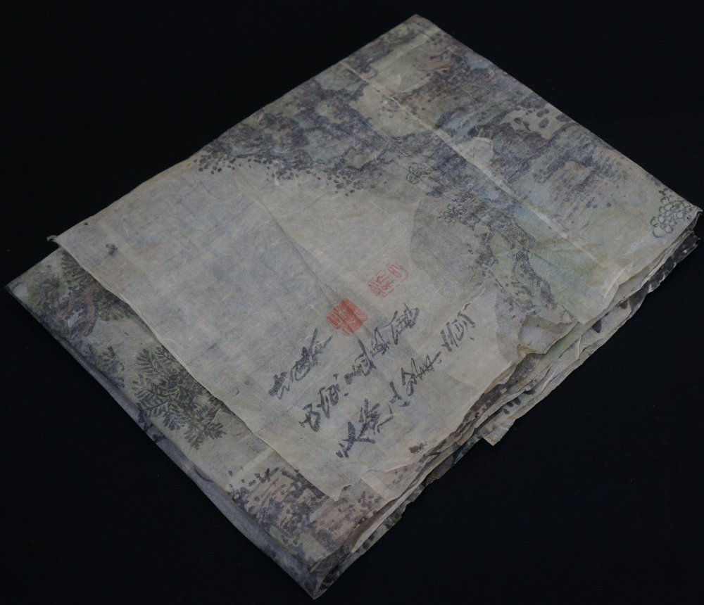 Antique Japanese mountain landscape with tea hut and wise man, Sumi-e sketch ink and watercolor technique on Washi paper painting, study from Kouzan (文衡山) XIV century artist, sketch  by Renzan Takaharu (連山孝治). Medium good conditions, some wear from time and usage. Immediately usable in its original conditions and folds.