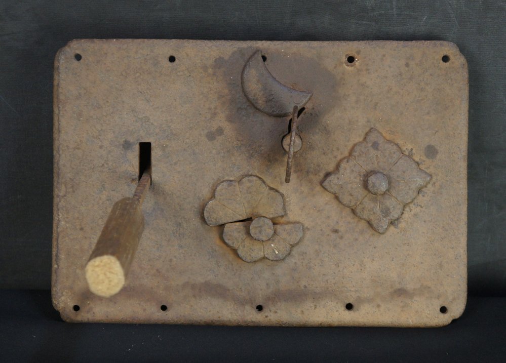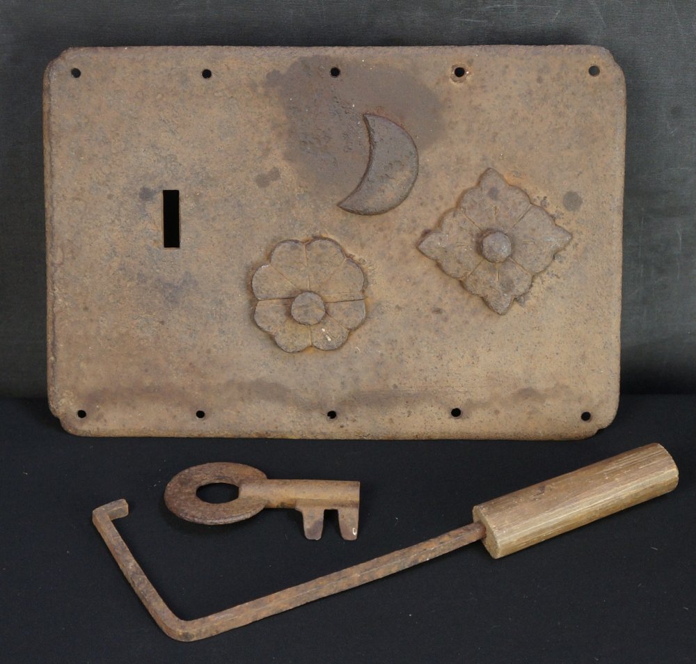 Antique Japanese Kura treasure house iron lock with working keys, blacksmith hand craft Edo era, good conditions all parts working, oxidation on all surface, nice patina. From antique Japanese Kura building featuring hidden locks under the Mon symbols. Well preserved, complete of key and large Kura key, immediately usable.