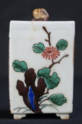 Antique Japanese Kutani Koro censer, abstract and floral motif, enamel decorations, well preserved with its protective wood box. Minimalist shape, wood kiln art, light wear marks from usage, no chippings no fractures. Immediately usable.