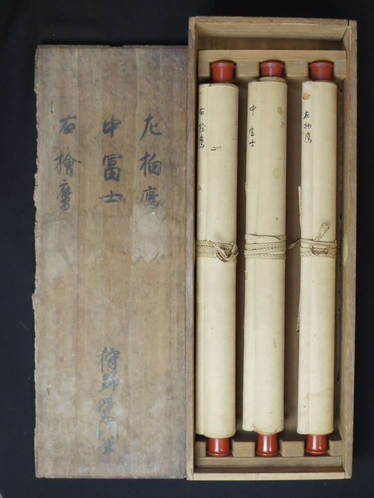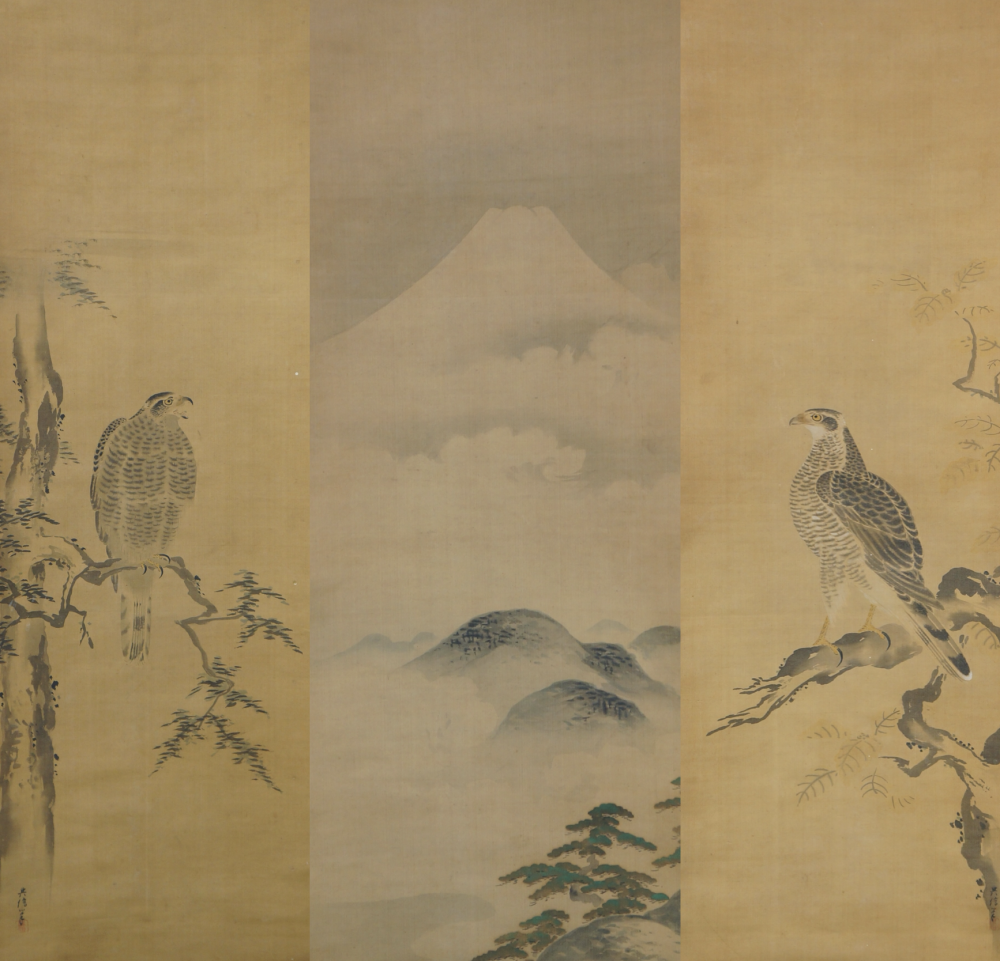 Antique Japanese Taka falcons and Fuji mountain mid Edo era, Sumi-e ink and watercolor technique on fine Kempon silk. Each scroll titled on box: Japanese cypress tree falcon,  Fuji, oak tree falcon, symbolizing rectitude and good auspice. All preserved with original Kiri wood signed box. Complete triptych design and made to be exposed  in a Tokonoma, Edo era most important space of the Japanese house. Each scroll is sealed and signed by Kanō Michinobu (狩野 典信, 1730 – 1790).