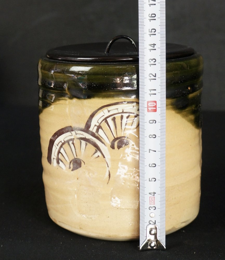 Fine master ceramist Tea Ceremony  Mizusashi minimalist Oribe ceramic jar in good conditions kiln expansion marks on top rim, hand craft decorated with abstract wild flower. No damages, good conditions, immediately usable.