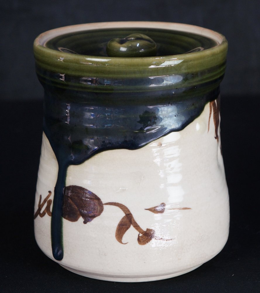 Fine master ceramist Tea Ceremony  Mizusashi minimalist Oribe ceramic jar in very good conditions and very nice glazing, hand craft decorated with abstract wild flower. No damages, good conditions, immediately usable.