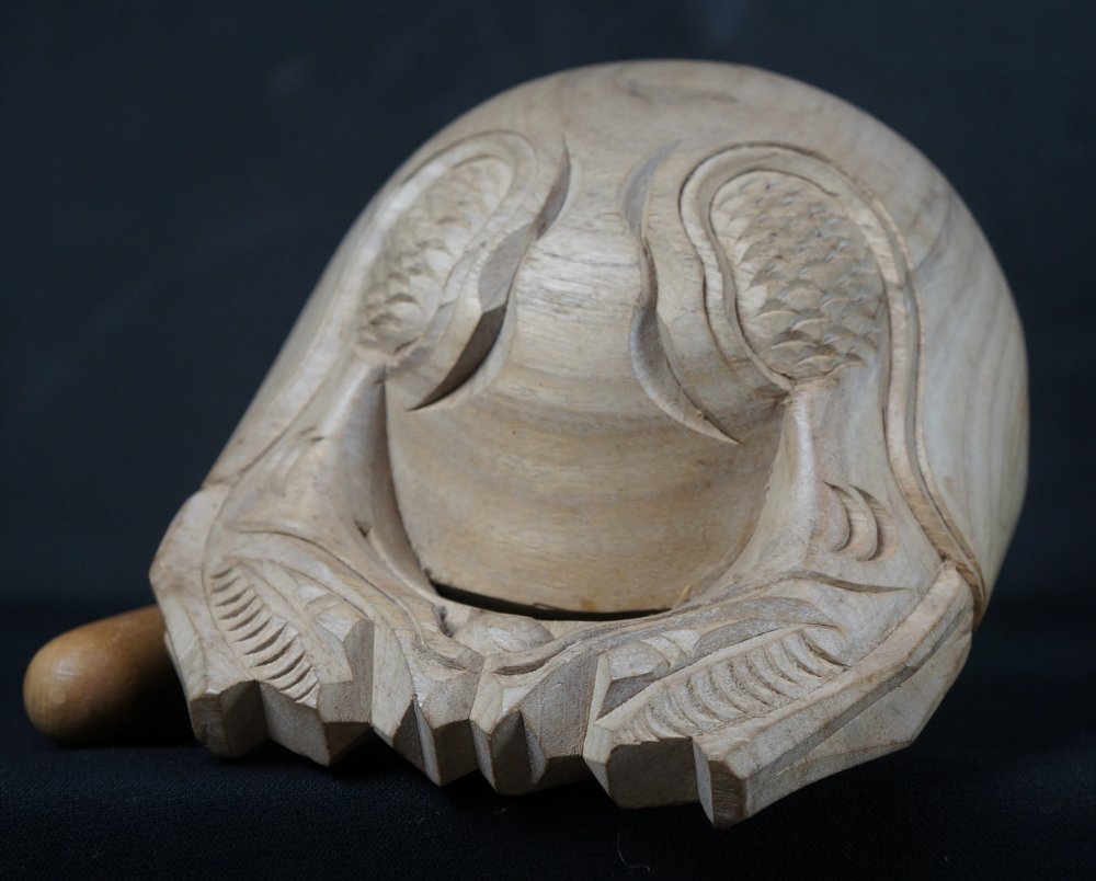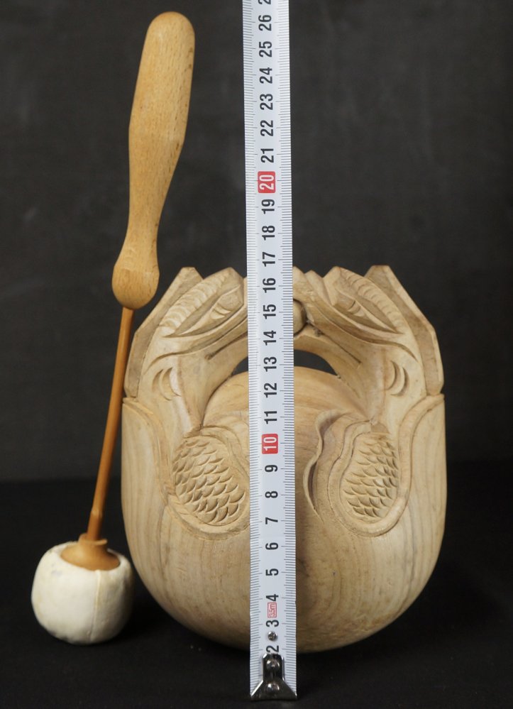 Japanese rural hand carved wood bell Mokugyo for Buddhist chanting, good conditions, nice sound immediately usable with wood Bachi hitter.