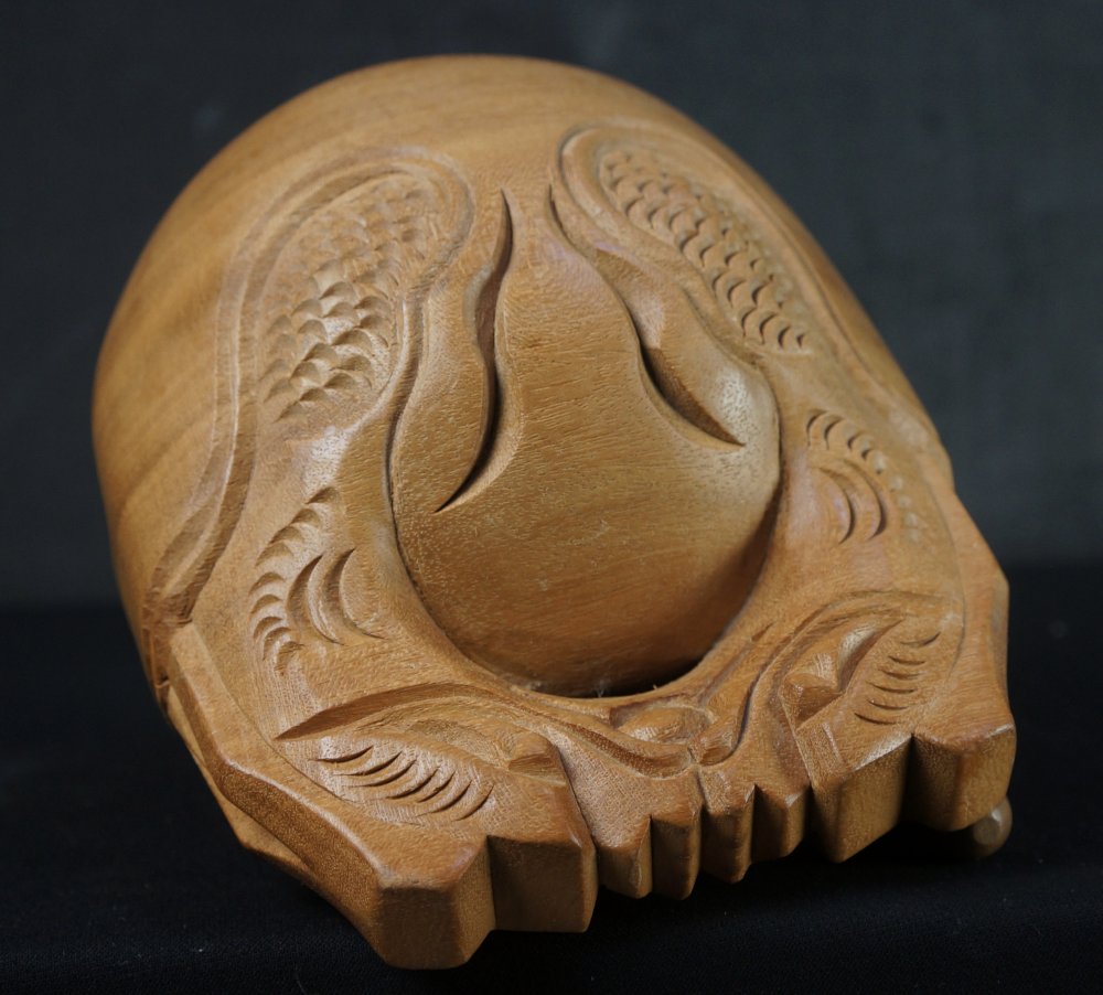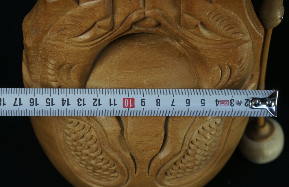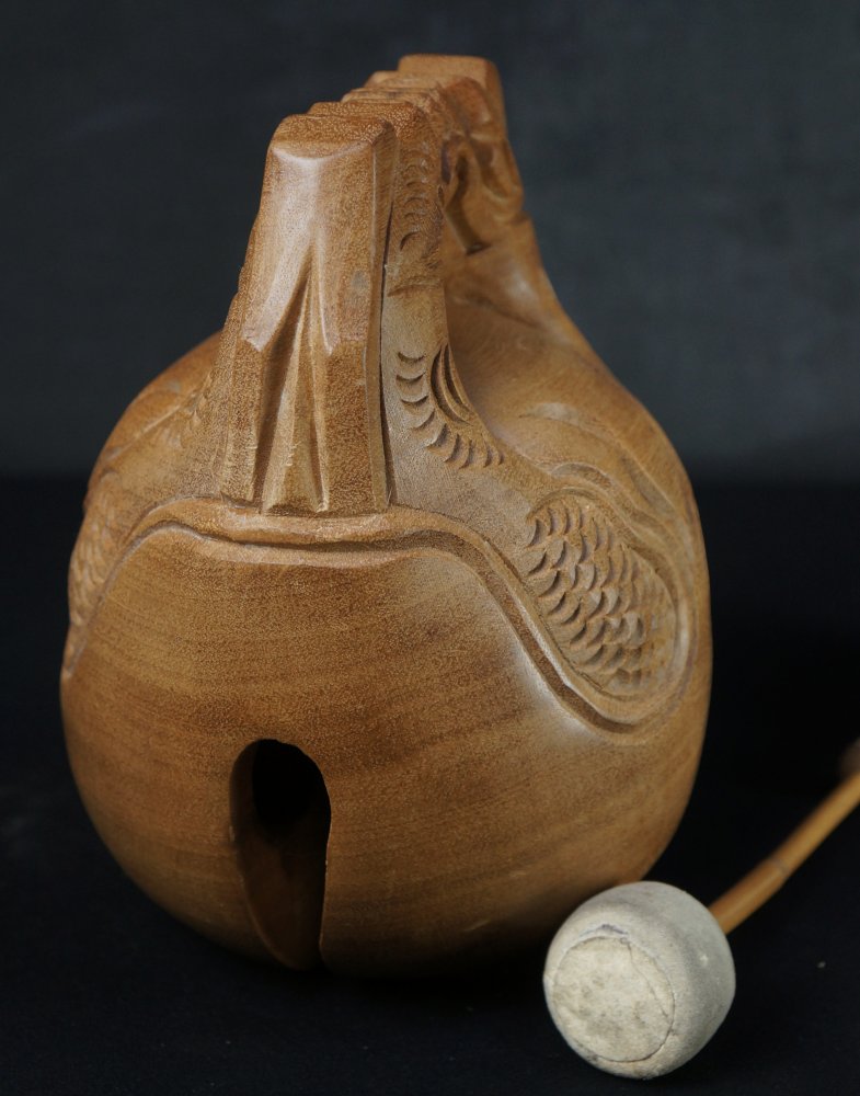 Japanese rural hand carved wood bell Mokugyo for Buddhist chanting, good conditions, nice sound immediately usable with wood Bachi hitter.