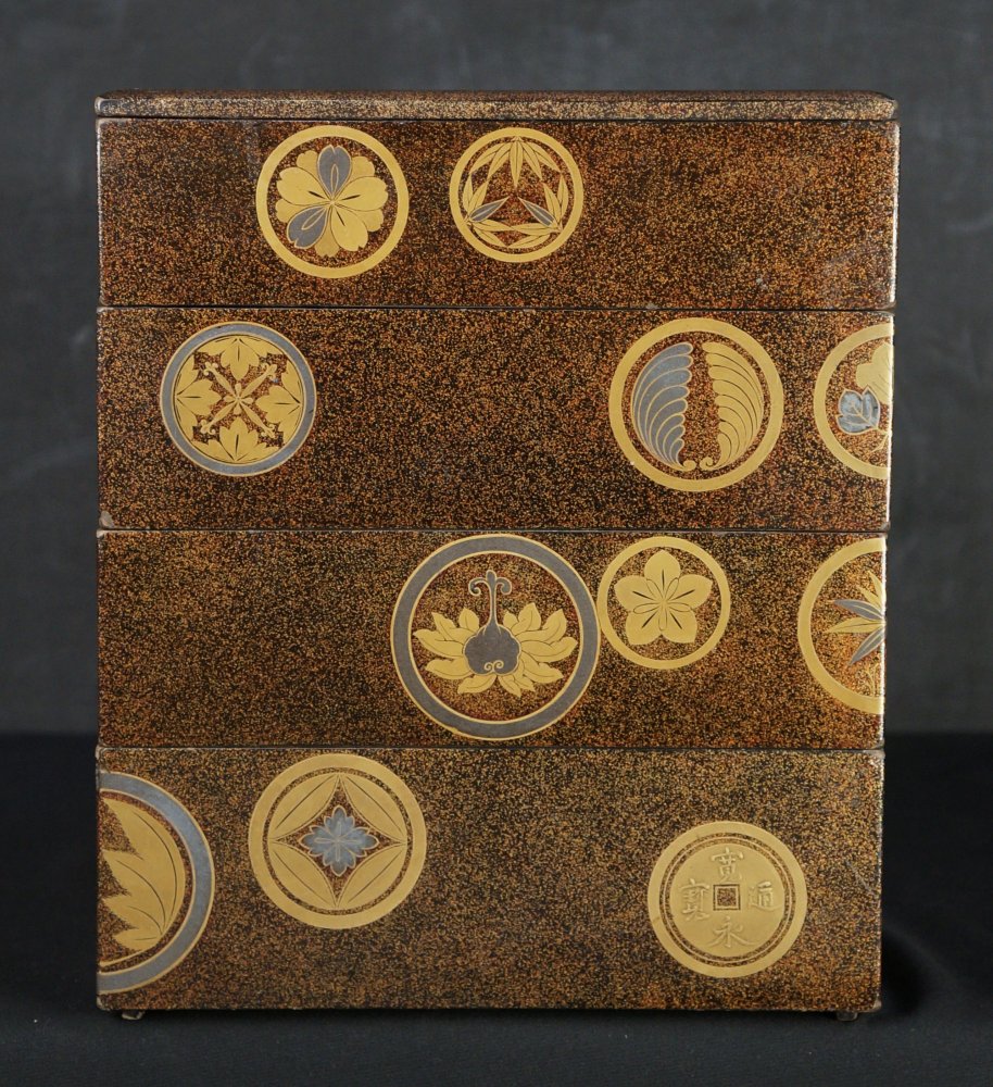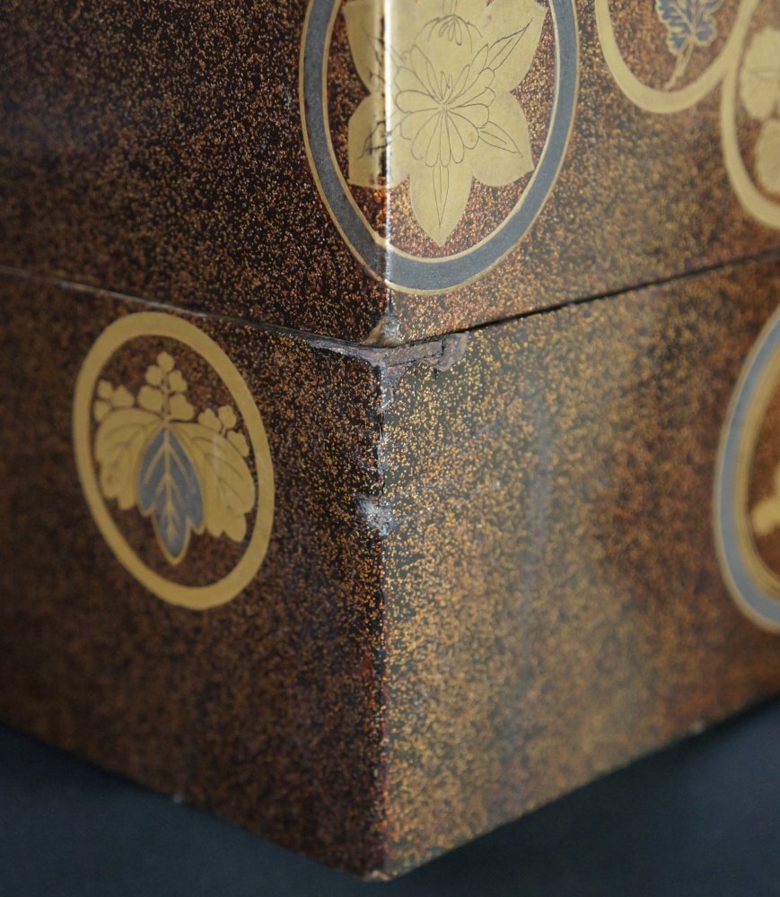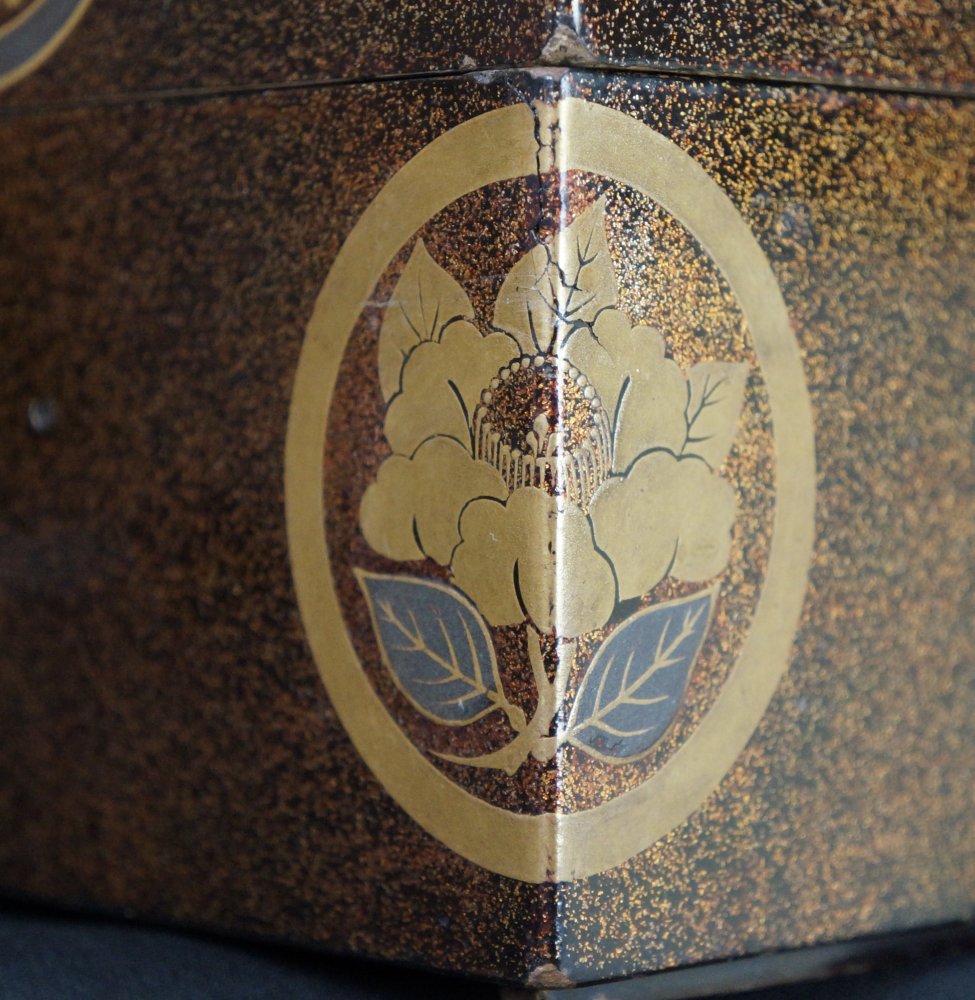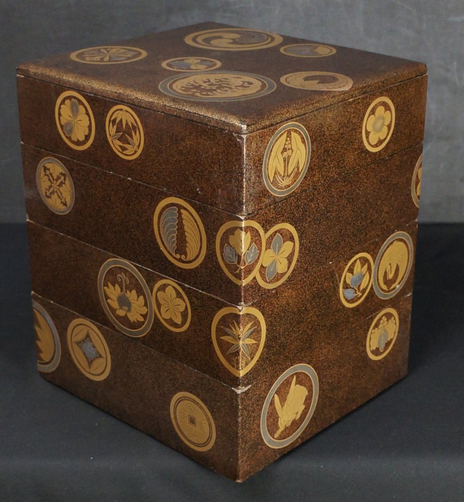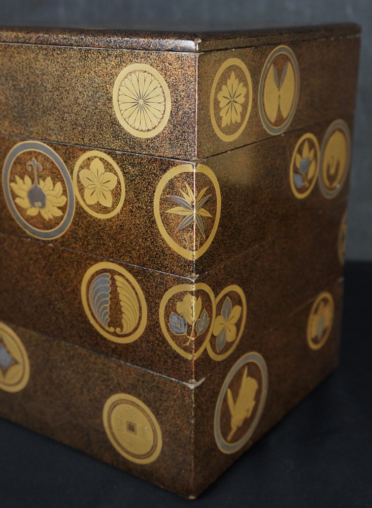 Japanese lacquered wood box Jyubako Bento food box with Maki-e lacquer Mon samurai clan motif. Maki-e decoration on all sides and lid, wear from long usage and time, wood expansion. Total of 4 food sections and  lid. To be used with care, Japan craft.