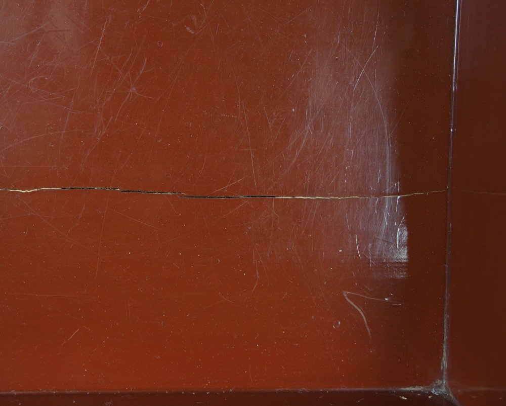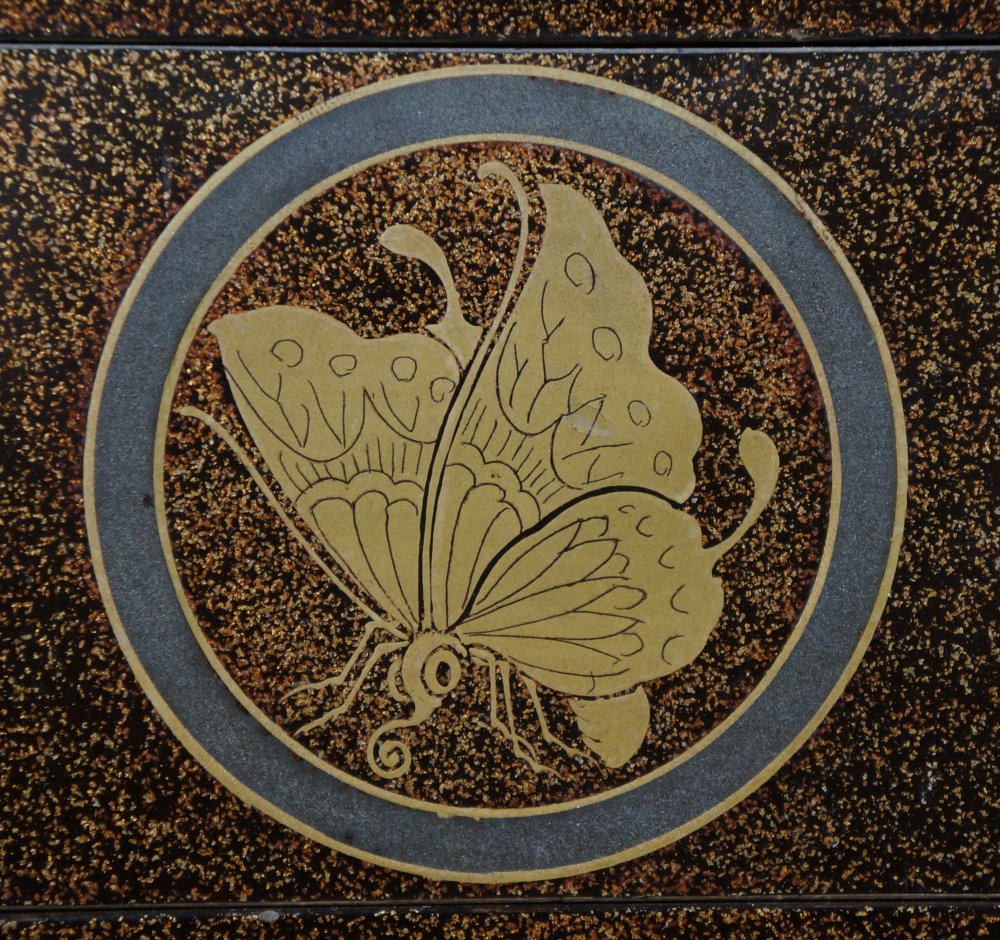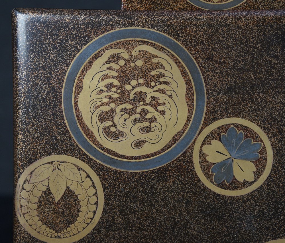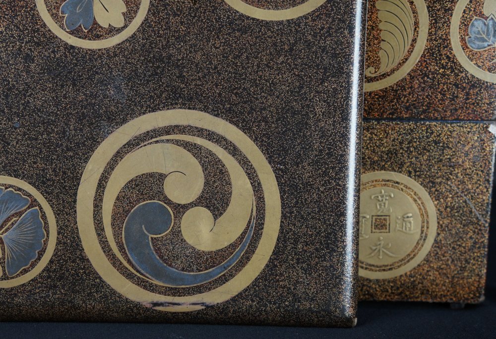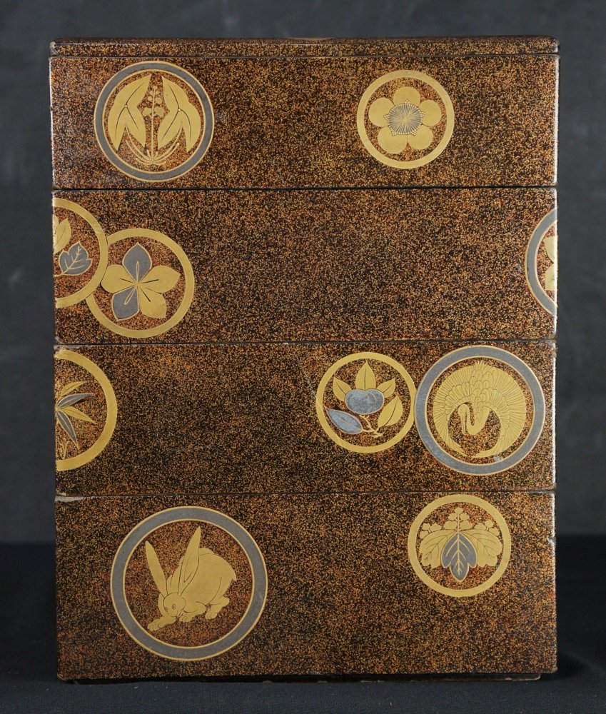 Japanese lacquered wood box Jyubako Bento food box with Maki-e lacquer Mon samurai clan motif. Maki-e decoration on all sides and lid, wear from long usage and time, wood expansion. Total of 4 food sections and  lid. To be used with care, Japan craft.
