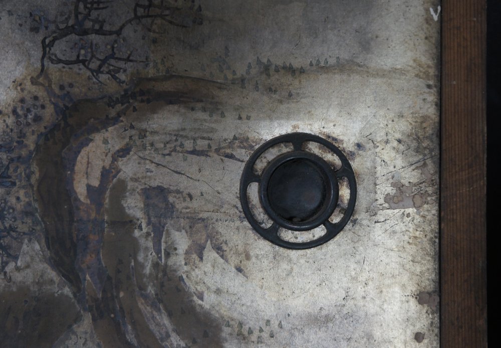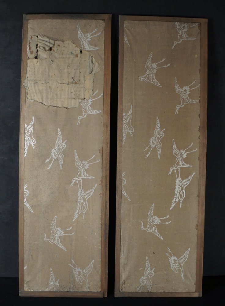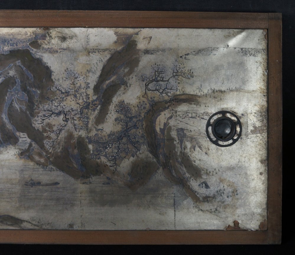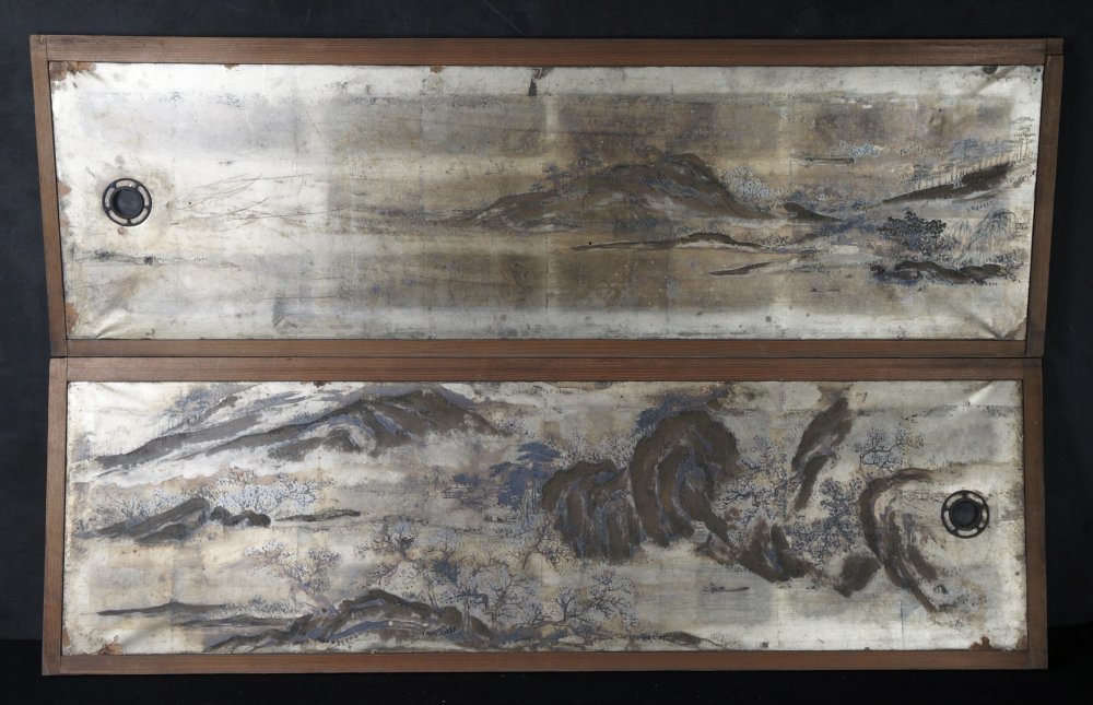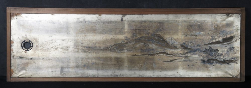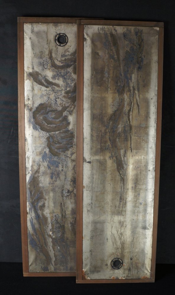 Antique Japanese Zen art painting, moon light landscape, silver leaf painting Sumi-e ink on silver technique, early 1800 Edo era, 2 panel painting from Japanese Tokonoma room. Medium conditions, wear from use and time. Silver leaf surface oxidation, original ink painting still visible. Bronze Hikite handles. Antique Edo era Tokonoma sliding panels.