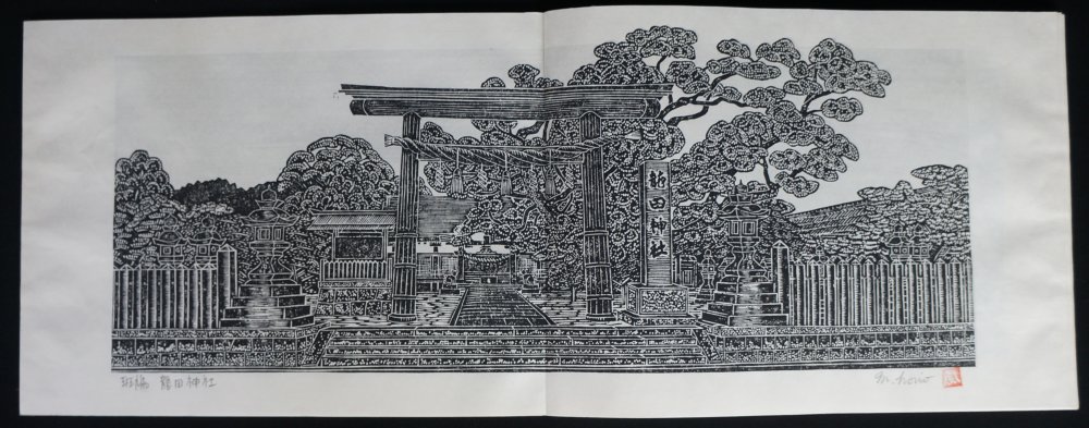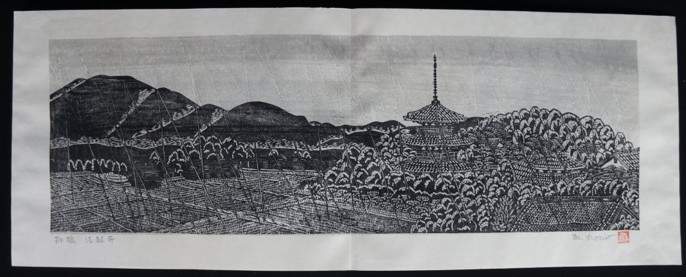 Japanese wood block print on Washi paper of Nara temple and shrines landscape, wood block print Moku-Han technique total of 11. Sealed and signed by artist on each print Horio Munehisa (堀尾宗久). Light wear from time and exposure. Each print can be divided from its book form and framed separately, Japan decorative arts