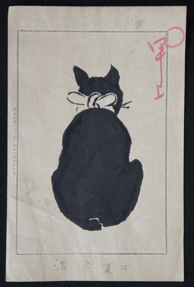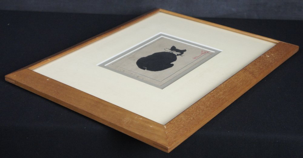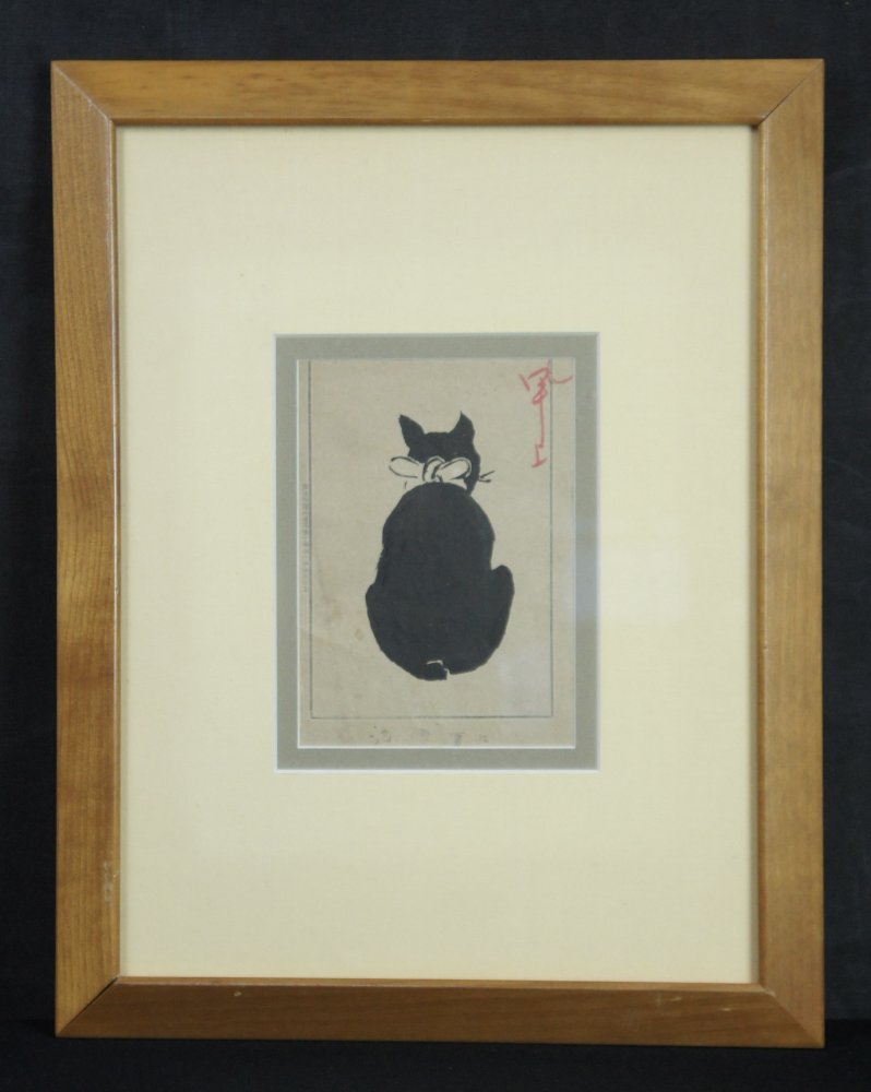Japanese Sumi-e ink art Neko cat on paper made on Hagaki post card size paper submit it for an artistic competition. Some wear from time and exposure, recent frame. Immediately usable in its original conditions.
