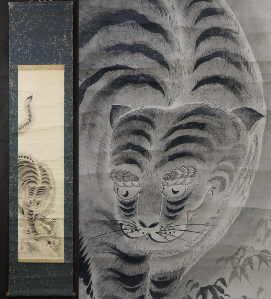 Antique Japan tiger Tora scroll Neko-Tora art 1900 hand painted on paper.
