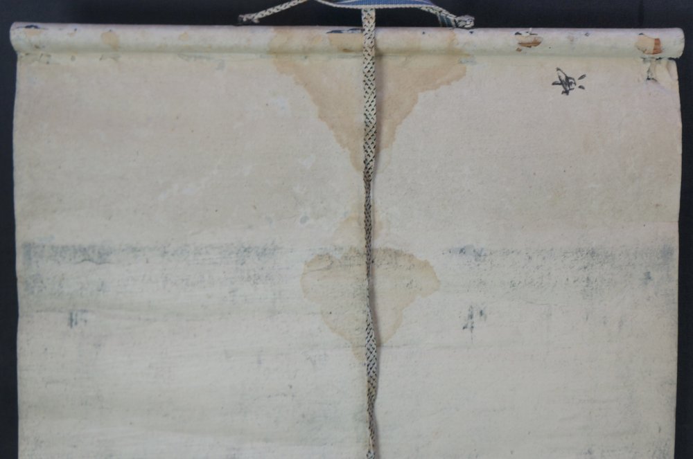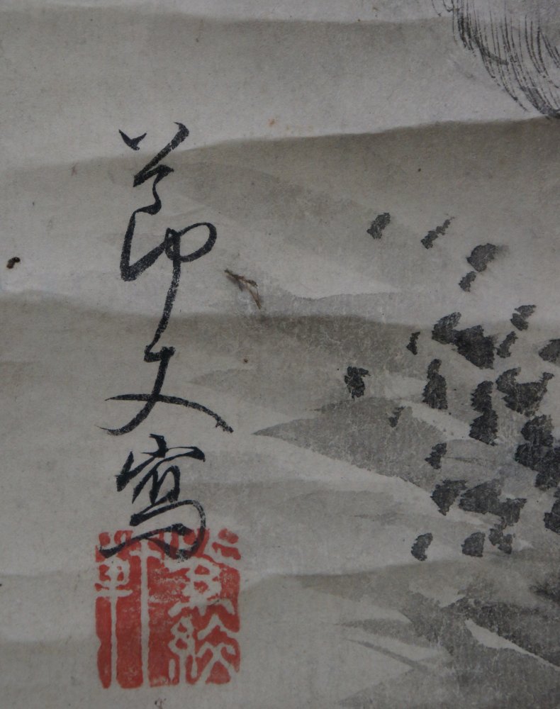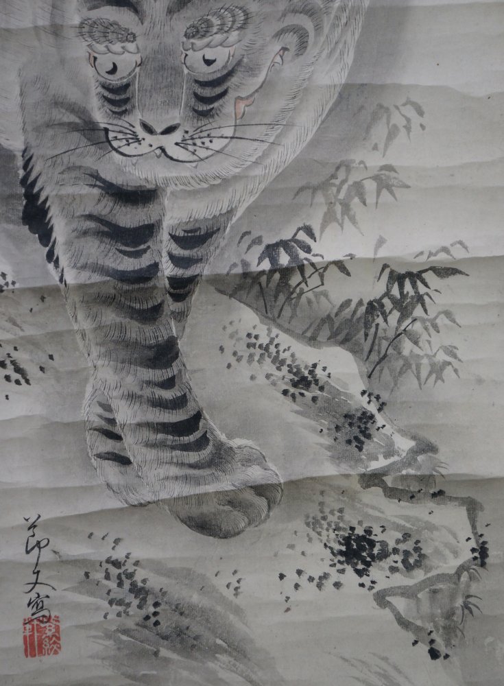 Antique Japanese tiger scroll painting, Sumi-e ink on paper technique, Neko-tora tiger-cat. Sealed and signed by Shibun (葹文). Some wear from time and exposure, humidity markings on top area. Immediately usable in its original conditions.