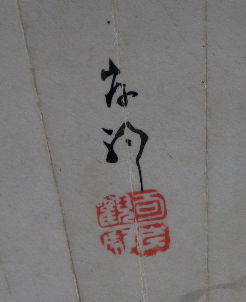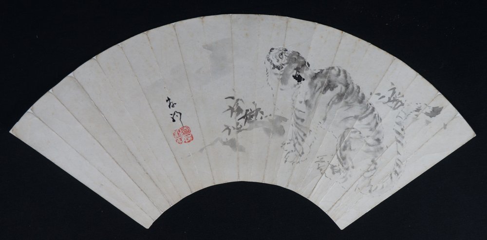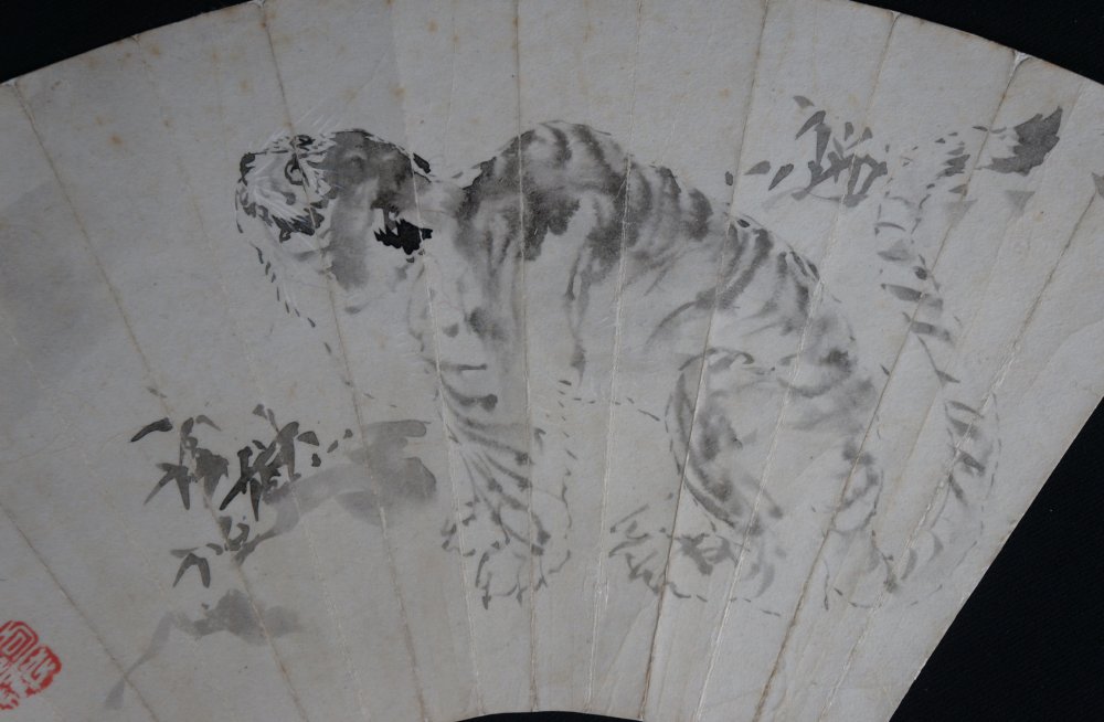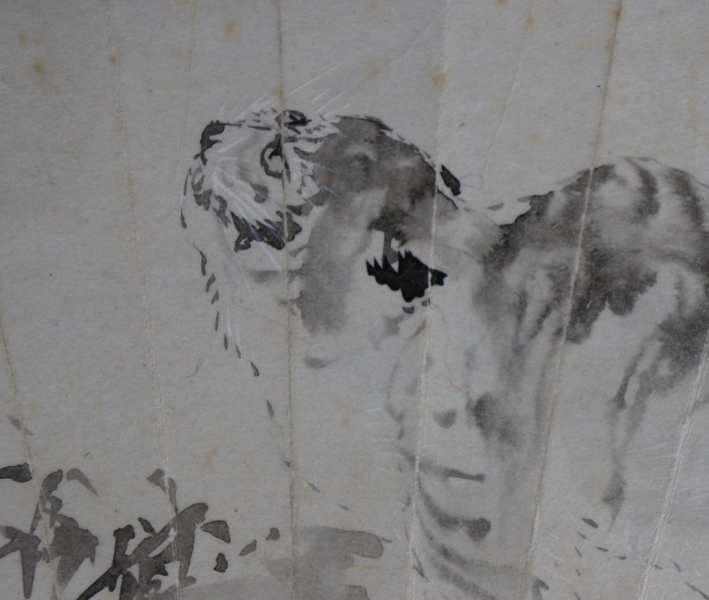 Japanese painting on paper of Neko-Tora tiger cat, Fude brush technique and Sumi-ink,  once mounted on a Sensu fan it has been detaced from a sliding rdoor. Good conditions, some wear from exposure and handling. Sealed and signed by artist. Immediately usable.