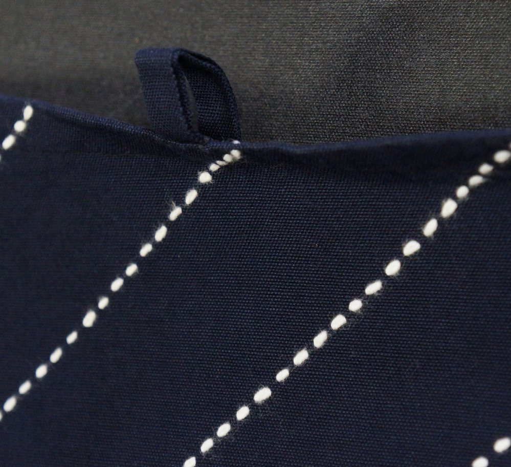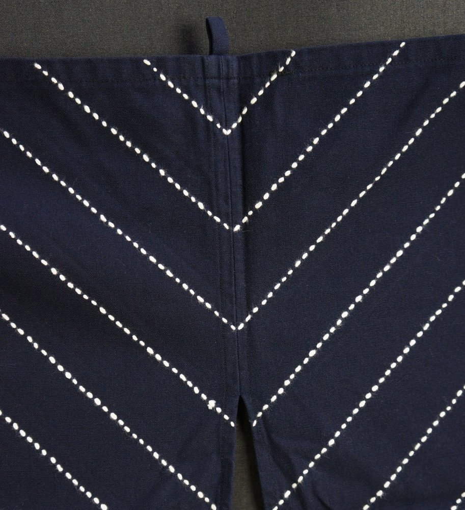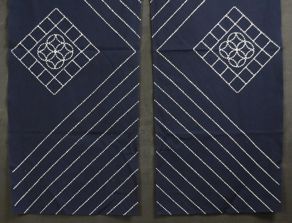 Hand made Japanese Noren curtain Takayama blue dye cotton decorated with white Himo geometric decoration. Niche character, good conditions, light wear marks from usage, Japan interior.