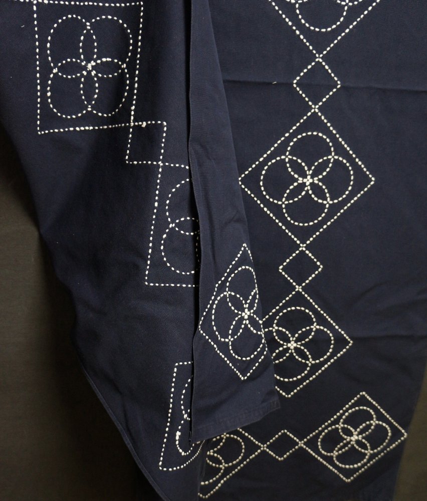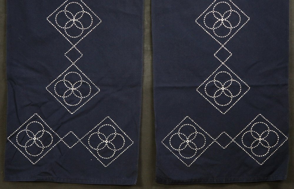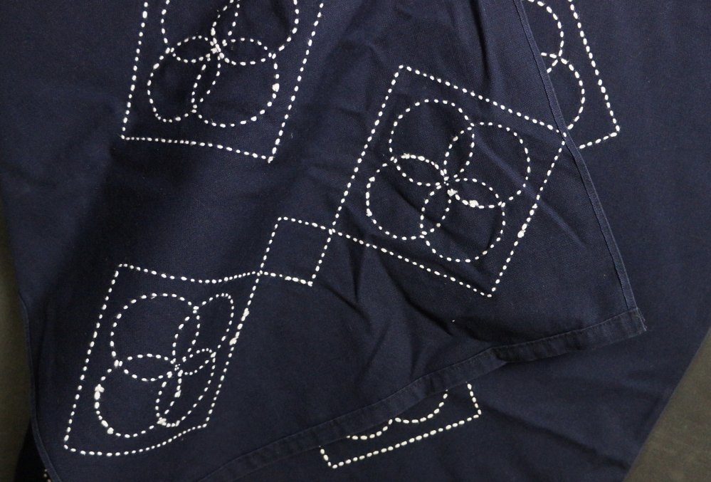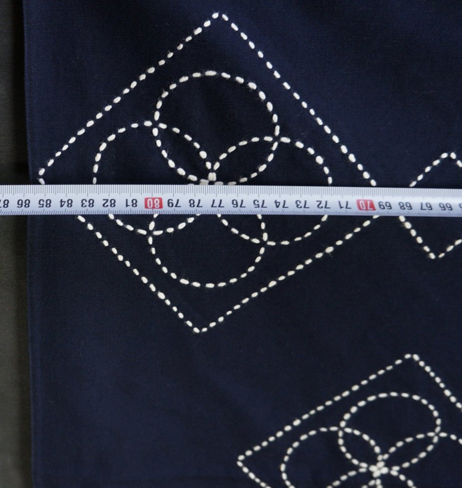 Hand made Japanese Noren curtain Takayama blue dye cotton decorated with white Himo geometric decoration. Niche character, good conditions, light wear marks from usage, Japan interior.