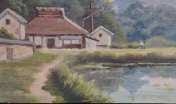 Nice Kyoto countryside oil painting by Okada Saburosuke (Imperial Household Artist 1869 - 1939). Very nice compositions, of Kyoto countryside with peasants homes and Buddhist pagoda in the back ground light. Oil technique on cardboard. Good conditions, no fractures. Nice gold leafed wood frame.