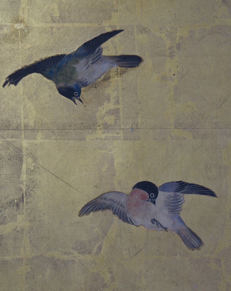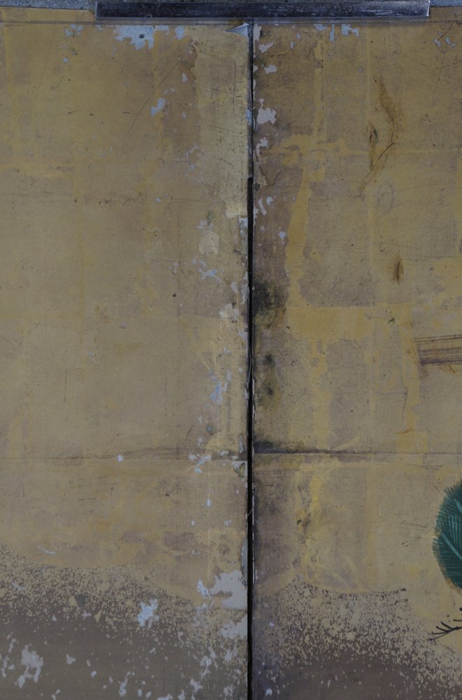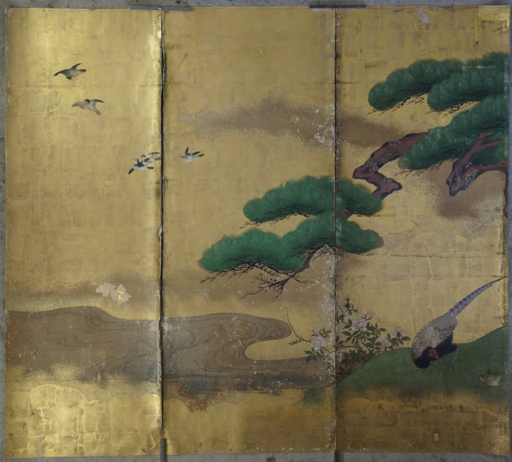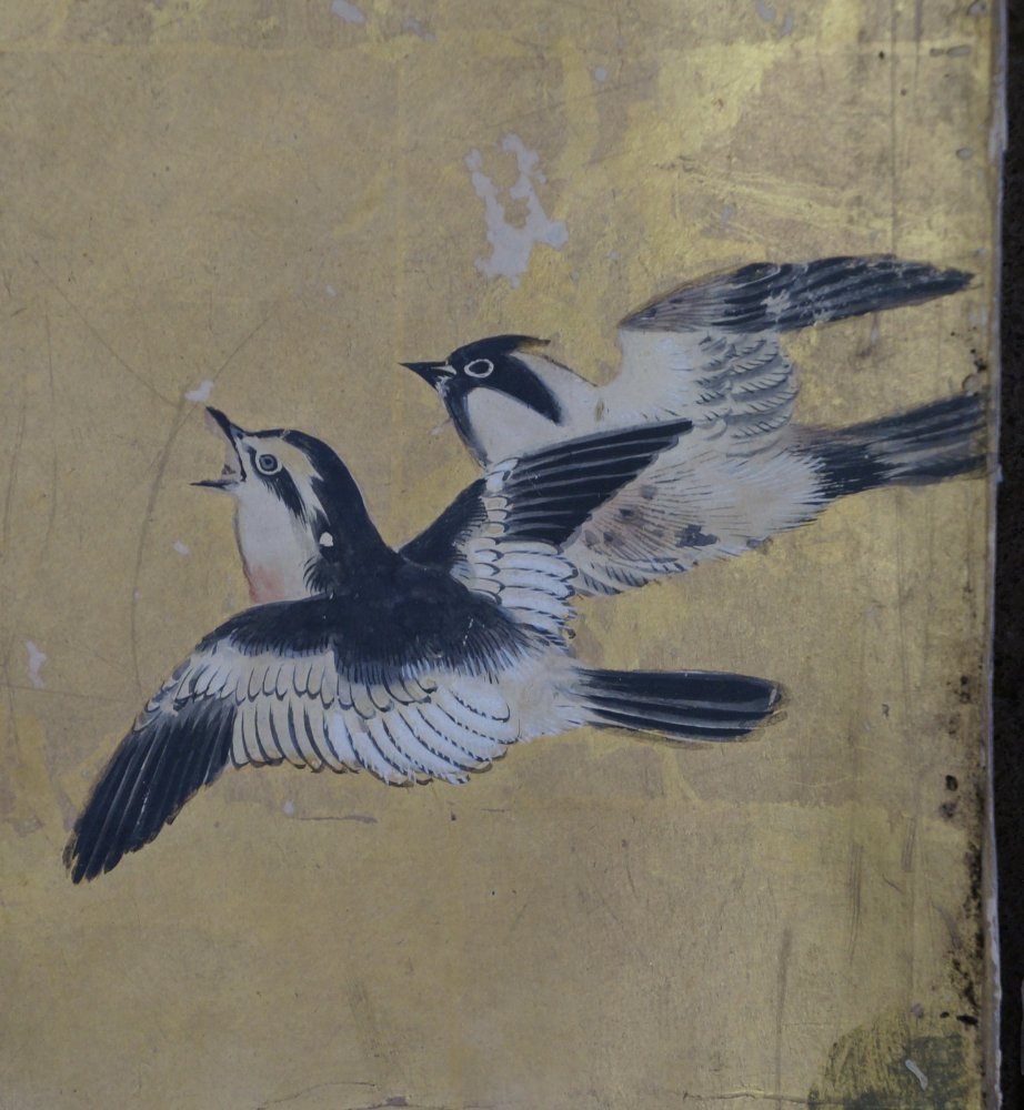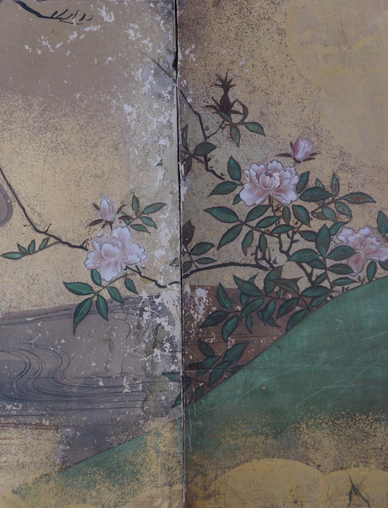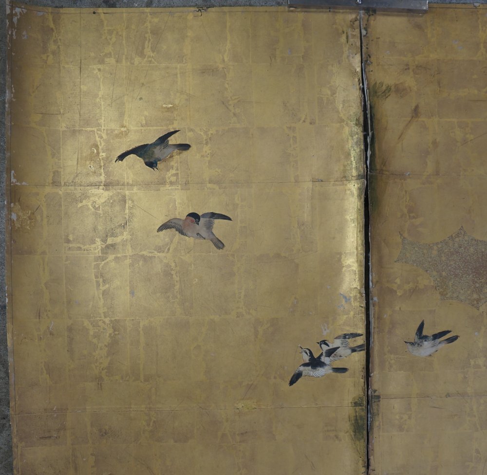 Signed by artist on lower left side: Kano Ryusetsu (狩野 柳雪 1647 - 1712) Ryusetsu school art craft. Medium good conditions, wear from time and exposure especially on border areas, old gold leaf restorations. Originally mounted on old wood wind screen panels they have been salvaged and partly restored.  Please visualize all photos (additional detailed photos available on request).