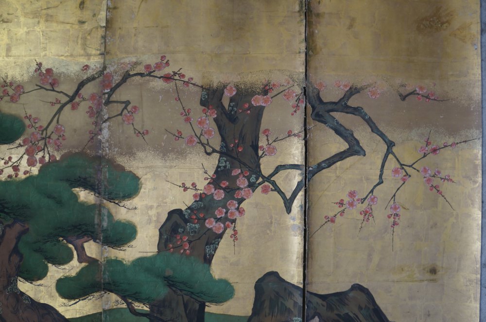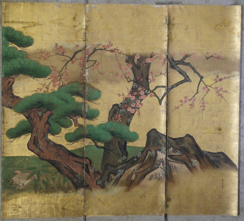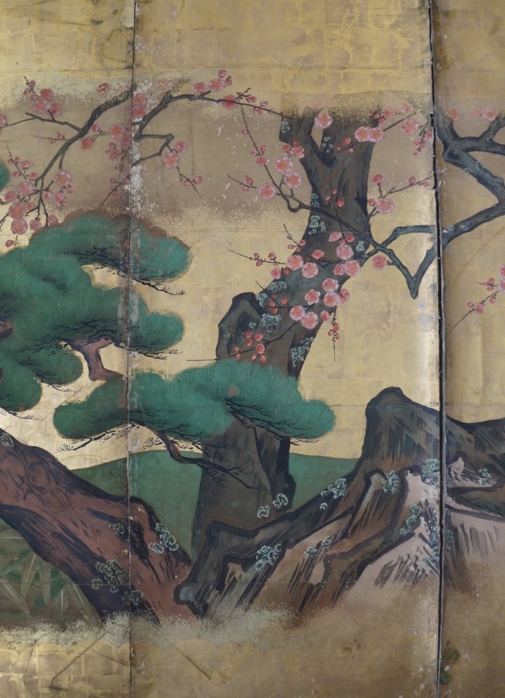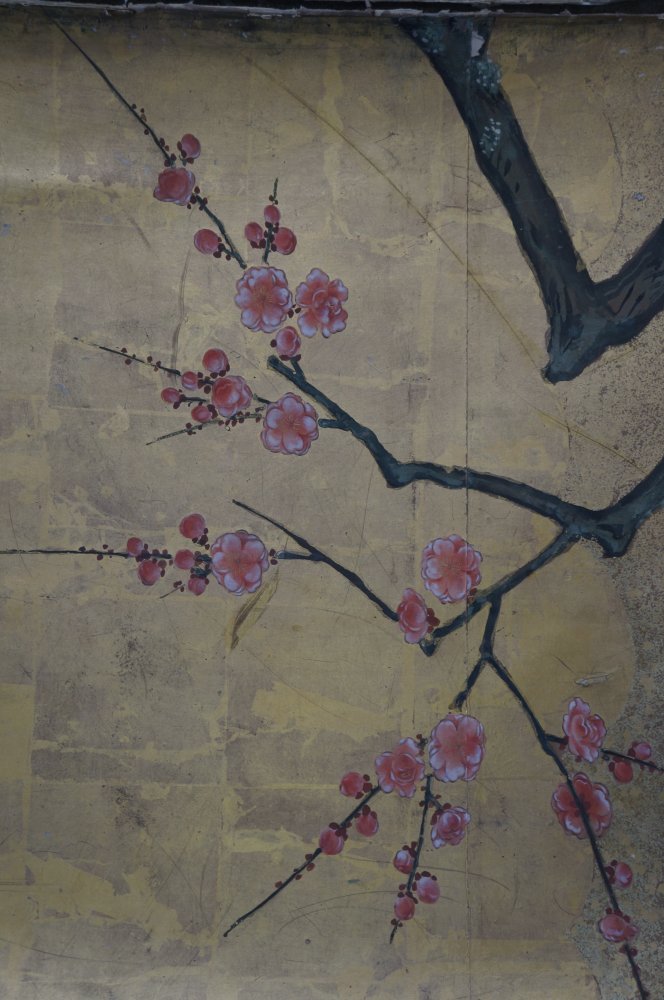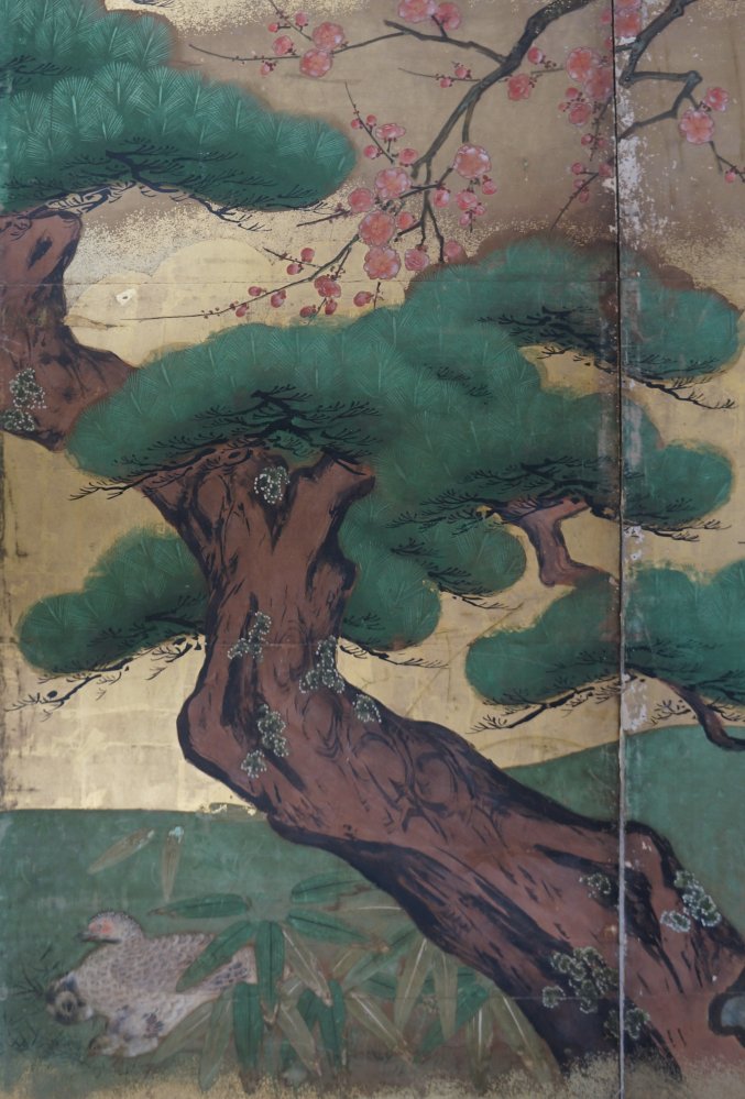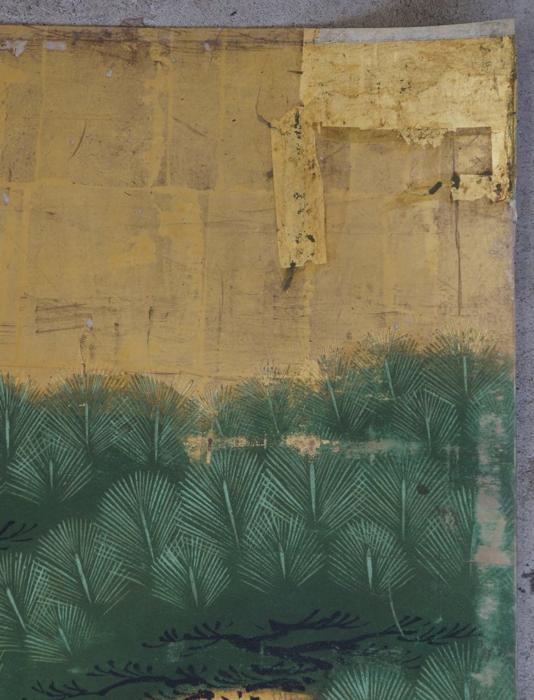 Signed by artist on lower left side: Kano Ryusetsu (狩野 柳雪 1647 - 1712) Ryusetsu school art craft. Medium good conditions, wear from time and exposure especially on border areas, old gold leaf restorations. Originally mounted on old wood wind screen panels they have been salvaged and partly restored.  Please visualize all photos (additional detailed photos available on request).