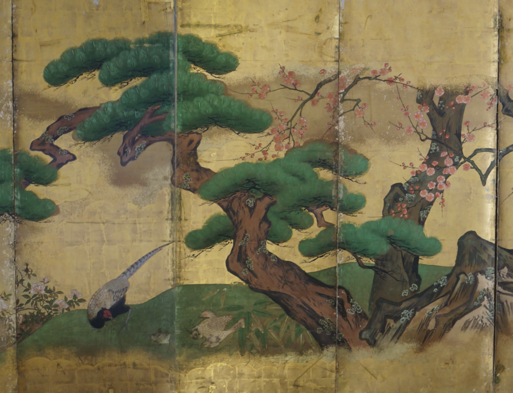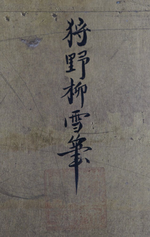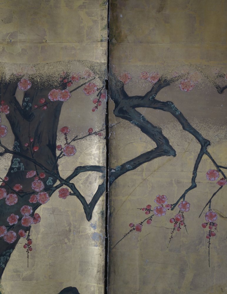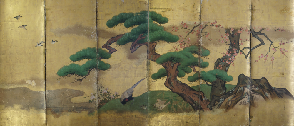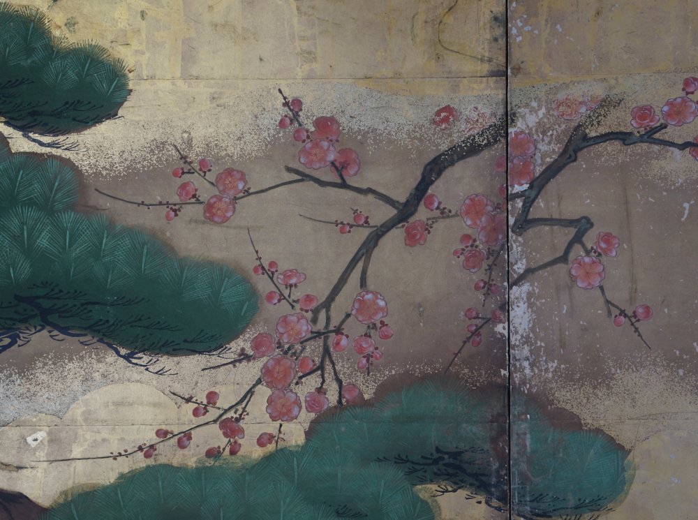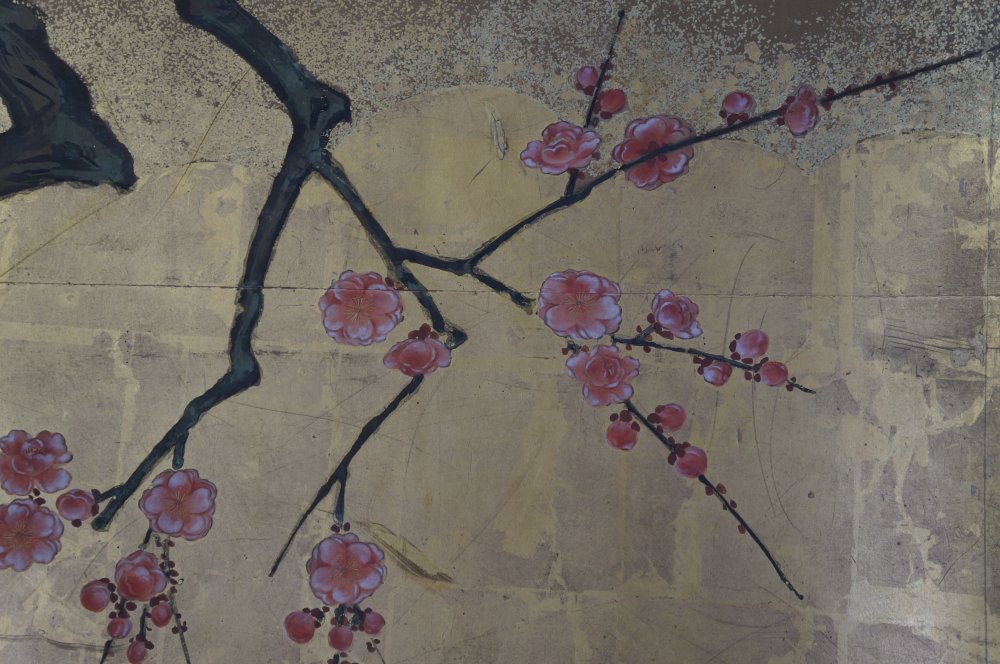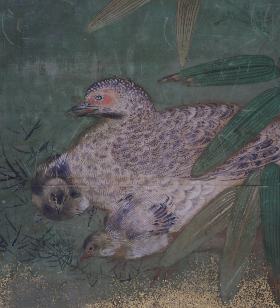 Signed by artist on lower left side: Kano Ryusetsu (狩野 柳雪 1647 - 1712) Ryusetsu school art craft. Medium good conditions, wear from time and exposure especially on border areas, old gold leaf restorations. Originally mounted on old wood wind screen panels they have been salvaged and partly restored.  Please visualize all photos (additional detailed photos available on request).