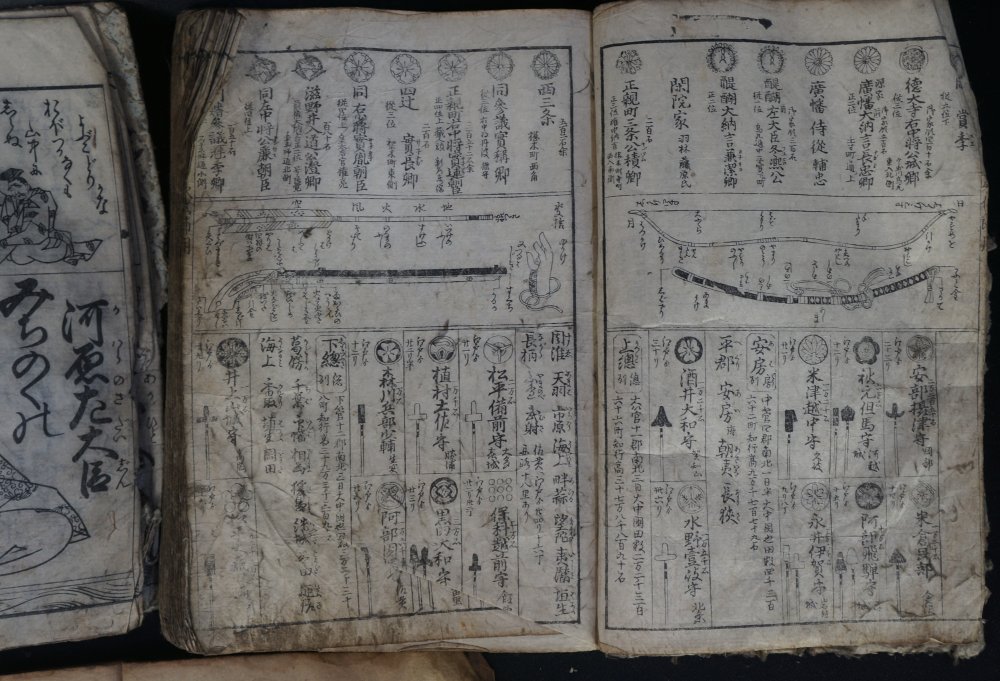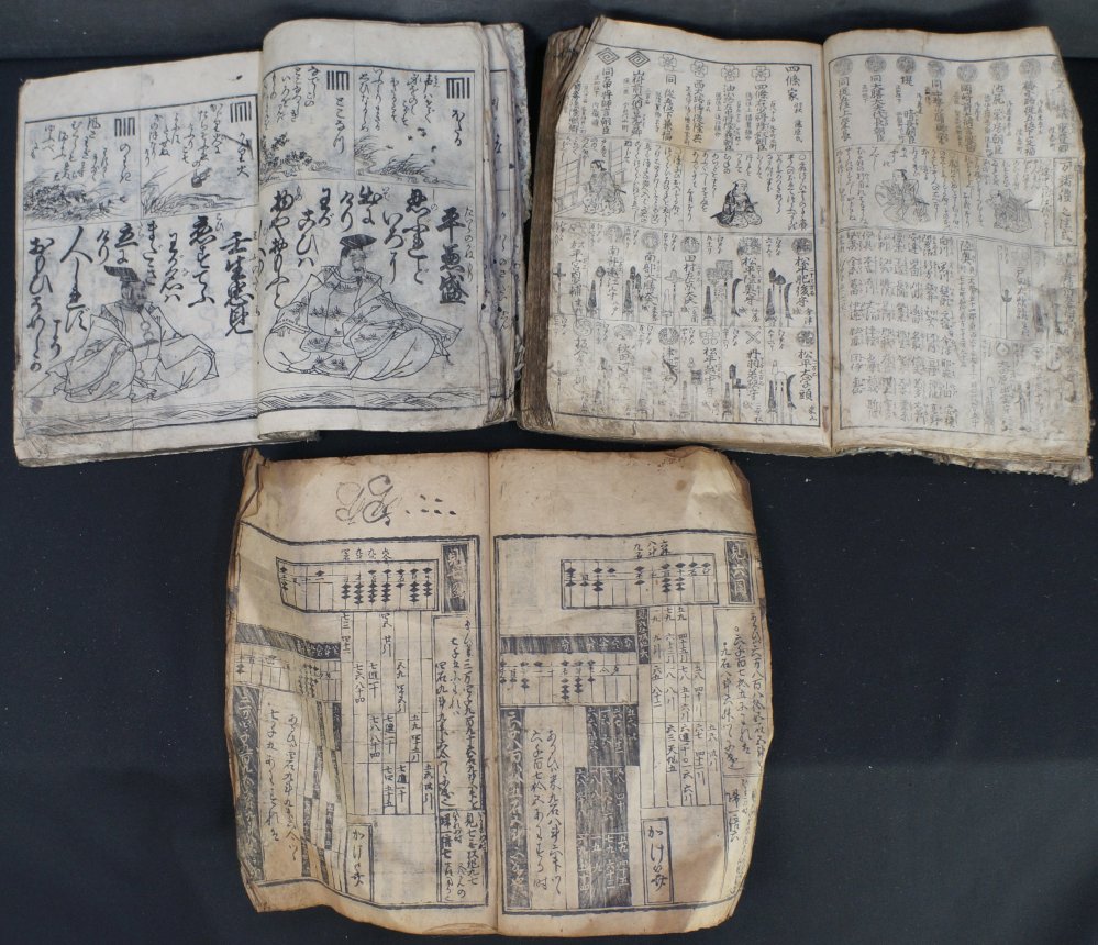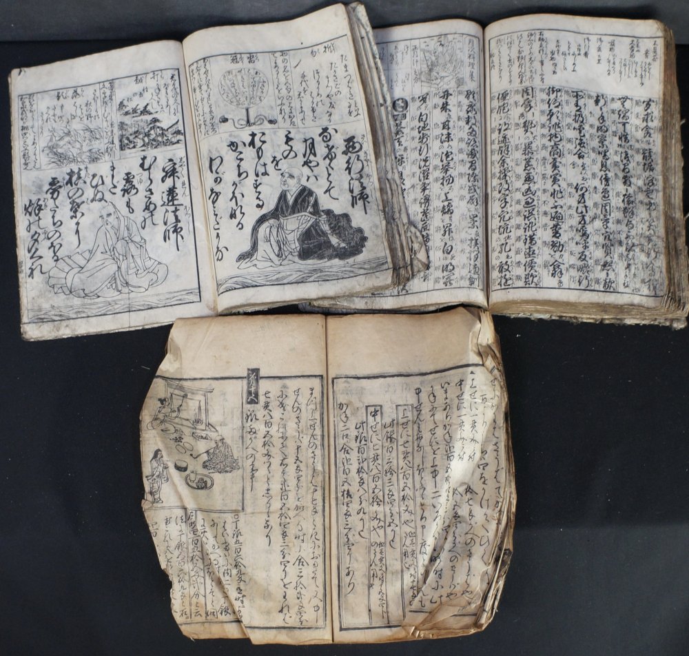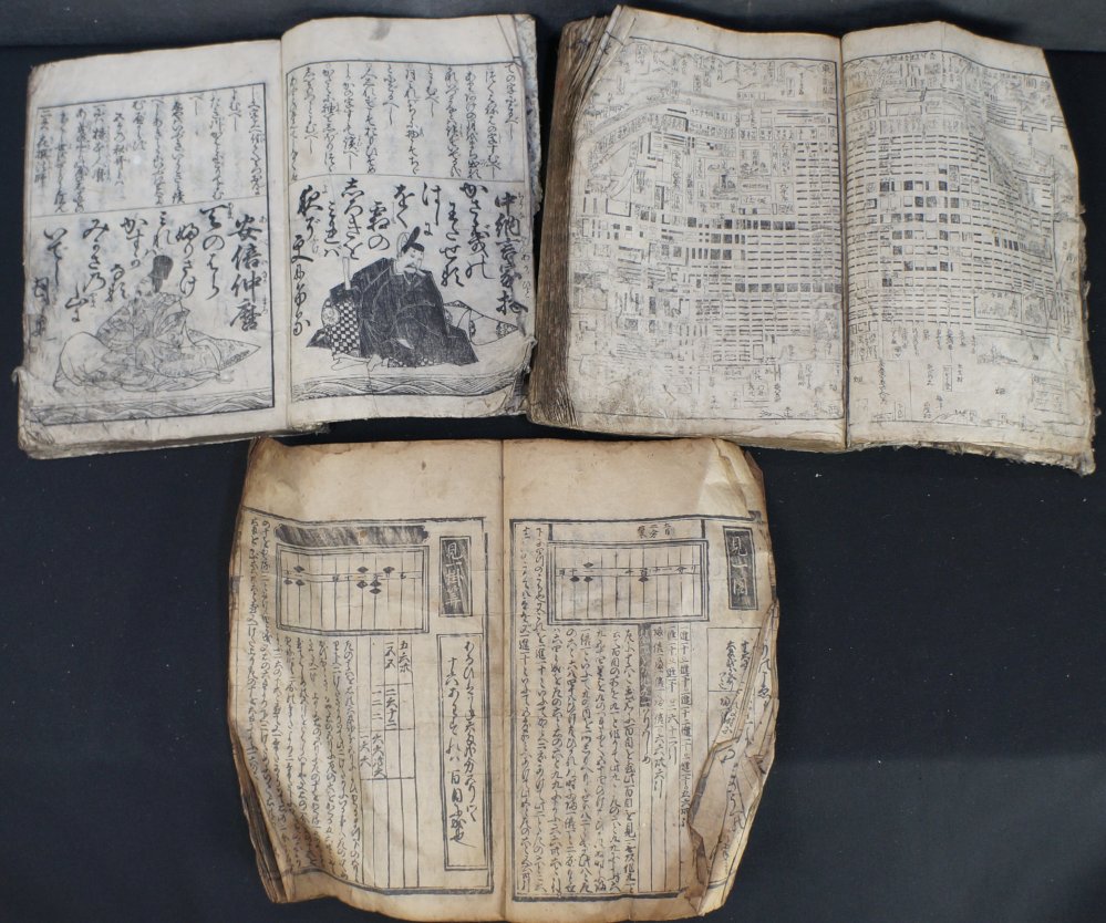 Antique Japanese book of Samurai culture, total of 3 books, in poor conditions, mid Edo period, extensive wear from time and handling. Do be handled with care, in original conditions.