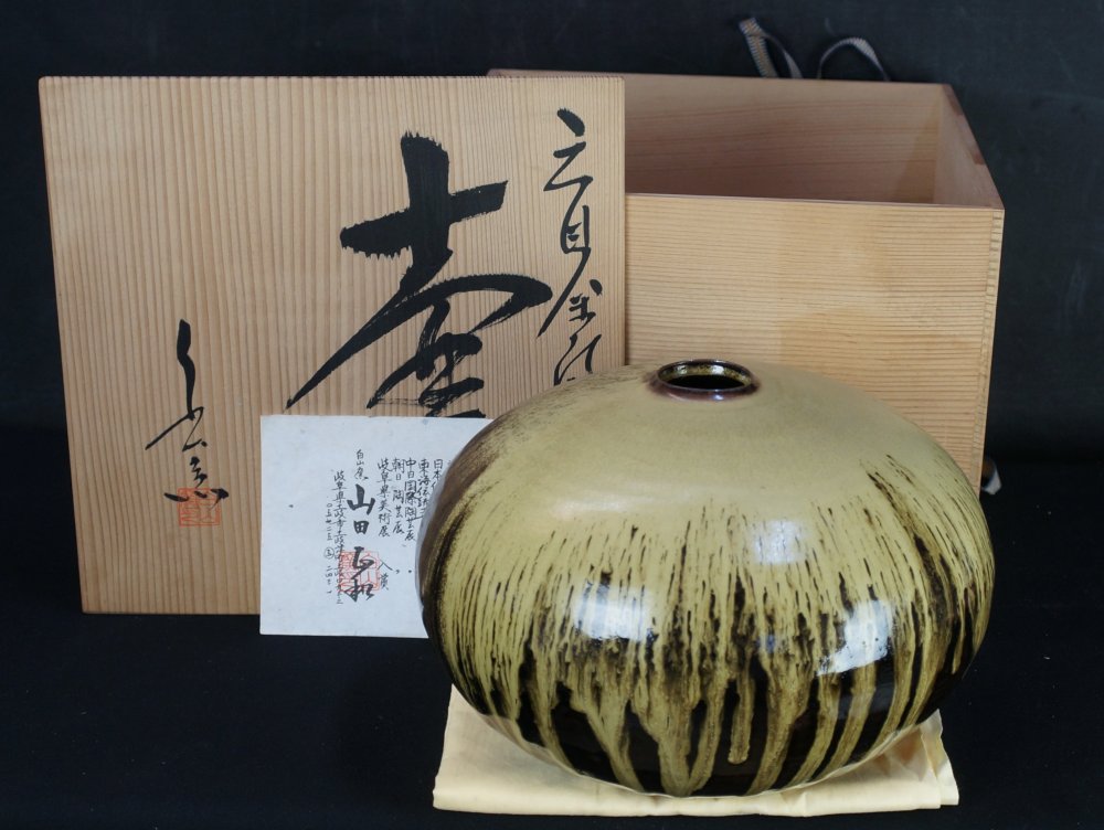 Fine Japanese minimalist ceramic vase Shinzangama wood kiln art craft, very good conditions nice glazing, made by ceramist master Ito Shinji (伊藤真司) . Immediately usable with its protective wood box.