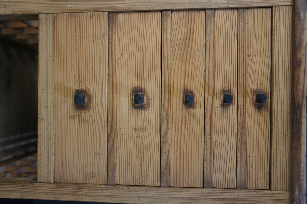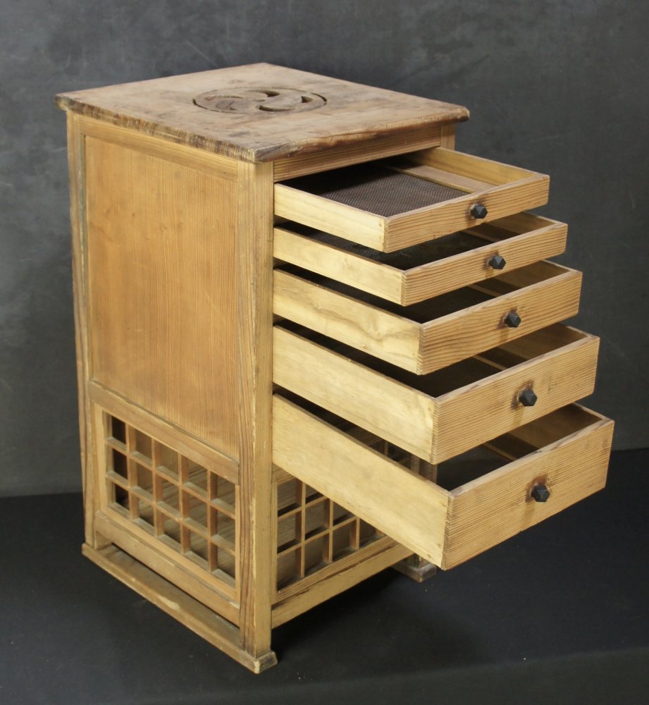 Antique Tansu Japanese furniture made of Kiri wood natural finishing, 5 drawers with metal mesh and bottom opening, Top opening for smoke/incense flow. Some wear from usage and time, in original conditions as found. Immediately usable, please see photos.