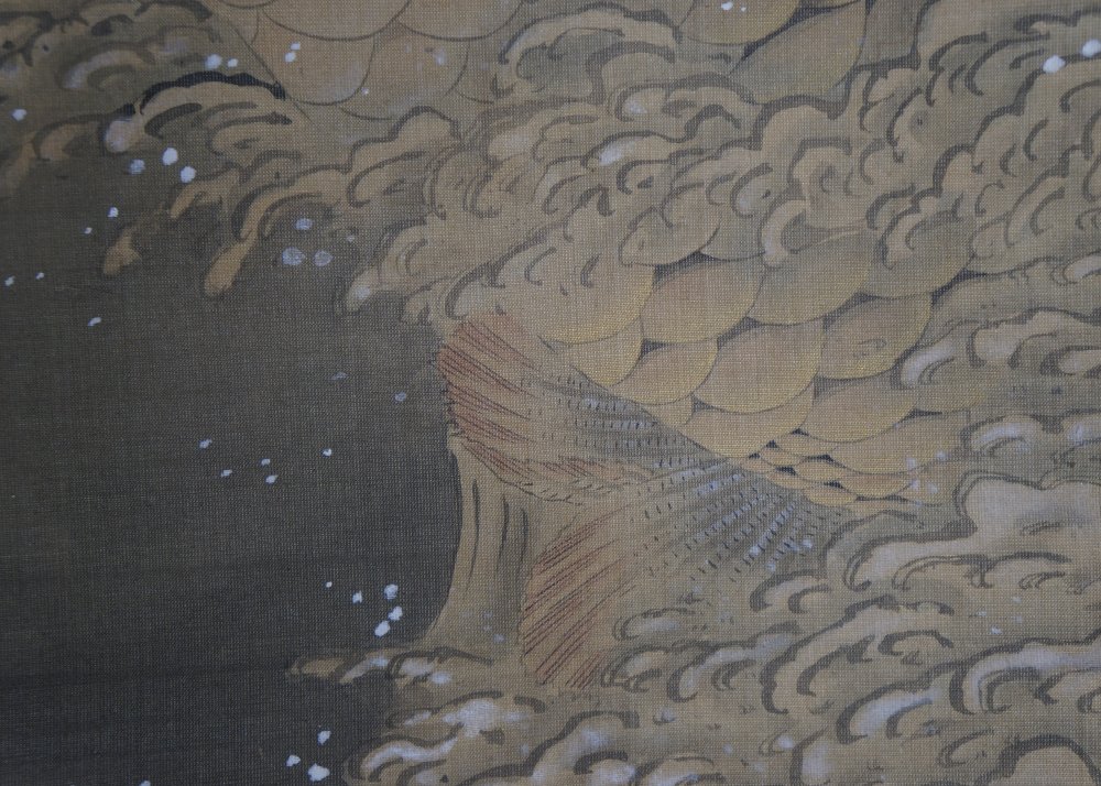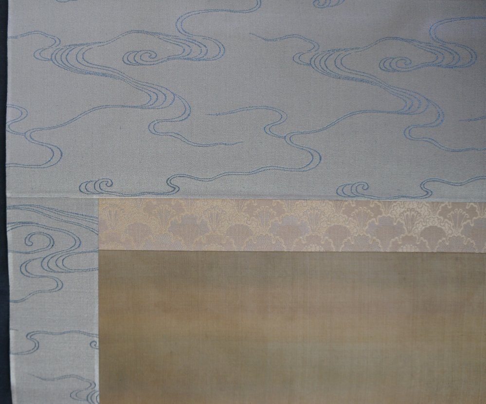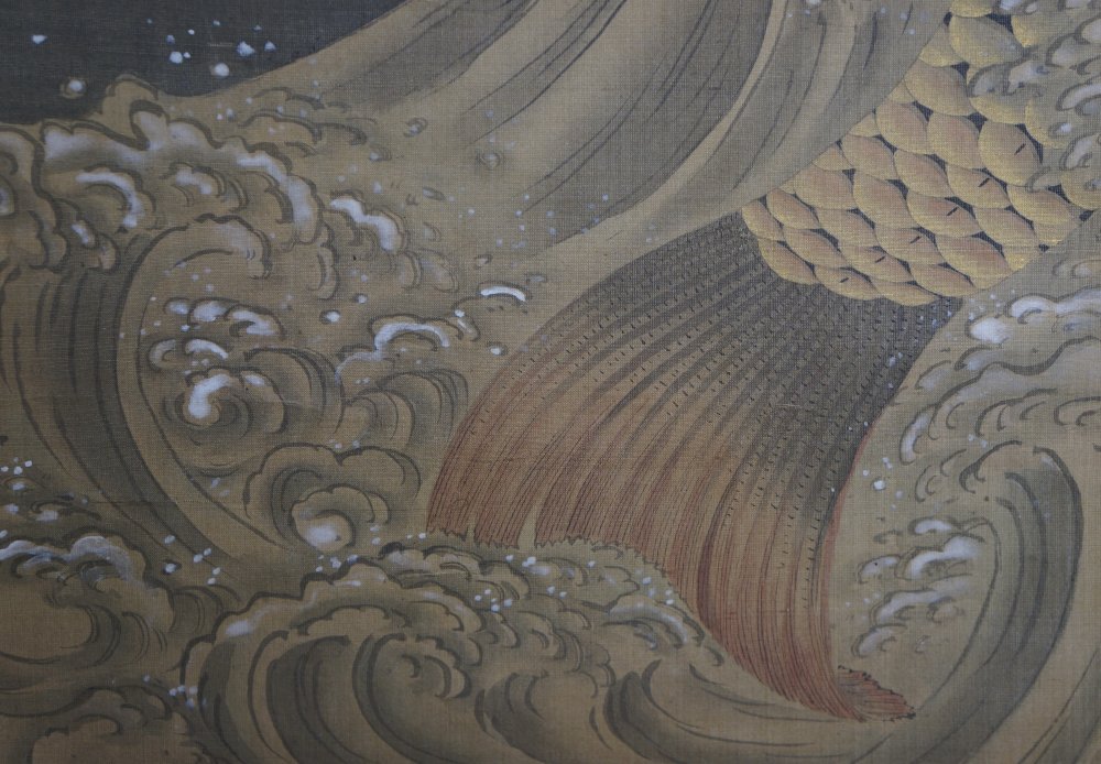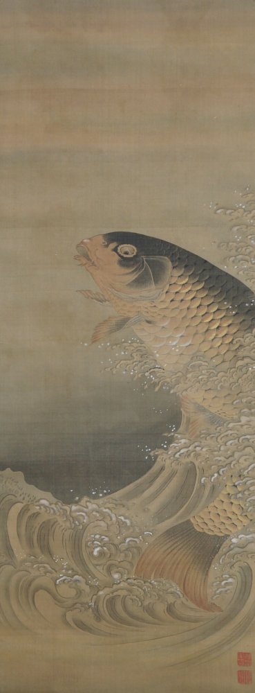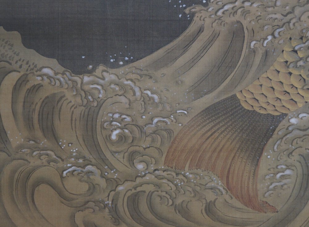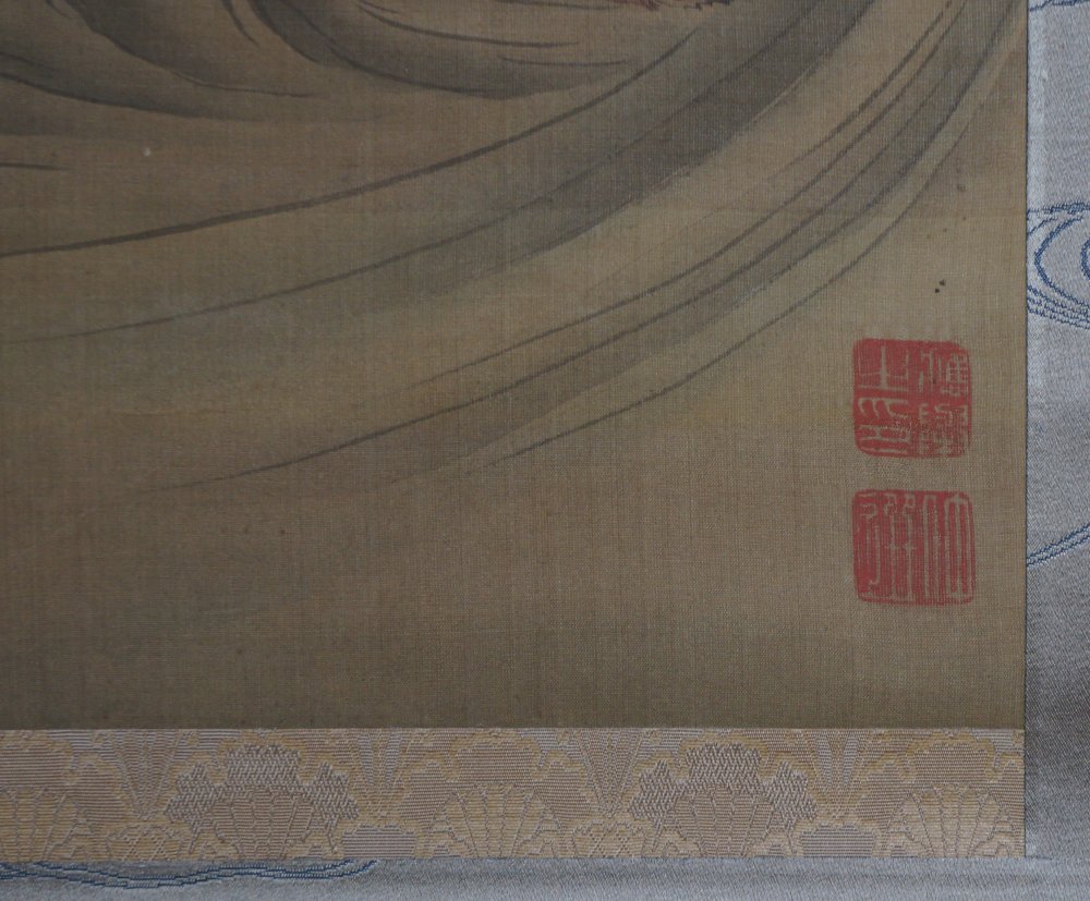 Fine art Japanese Koi carp in foamy waves Kakejiku scroll painted on silk, Sumi ink and watercolor brush technique on Kempon silk, very nice details, fine graphic. Very well preserved, nice silk borders. Sealed by artist associated to So-Shizan school (1850- 1890). Good conditions, very light wear from usage and time. Immediately usable with protective Kiri wood box.