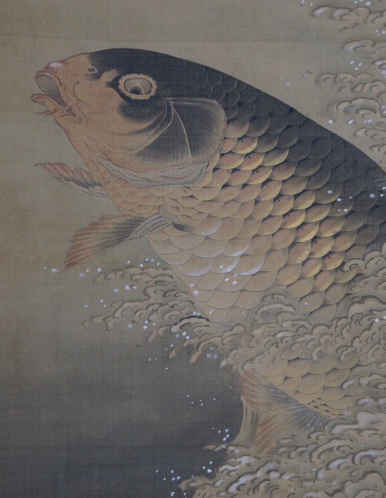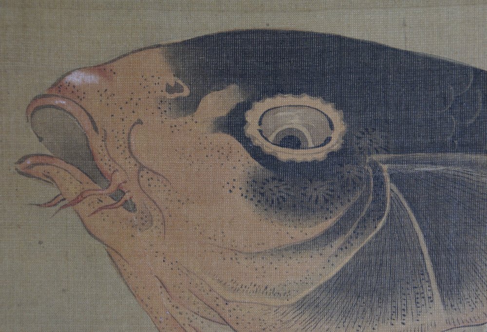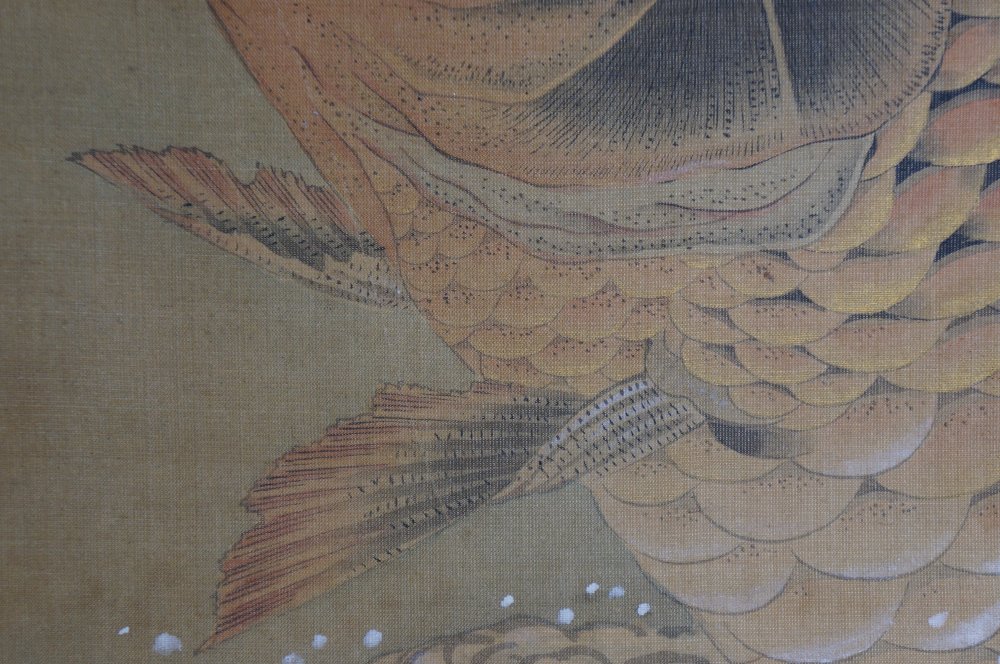 Antique Japanese Koi carp panting scroll 1880 wall hanging Sumi-e Kakejiku