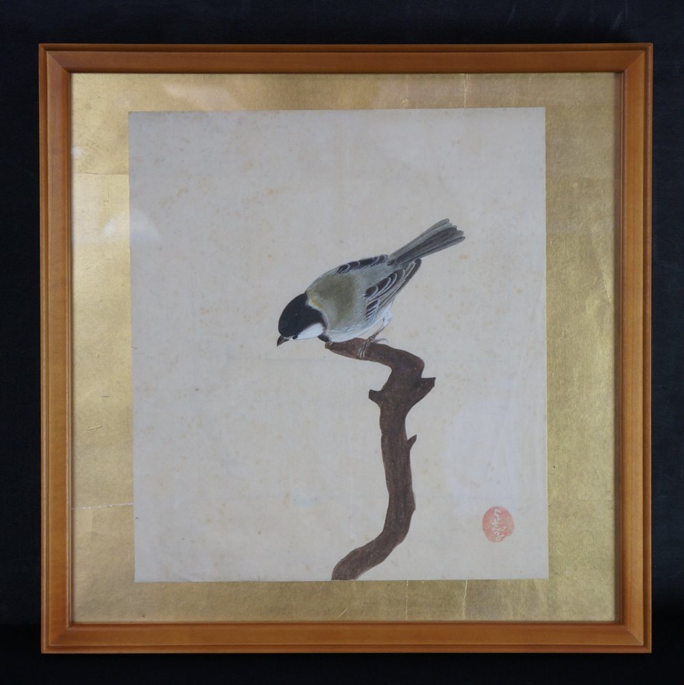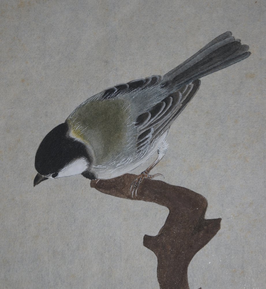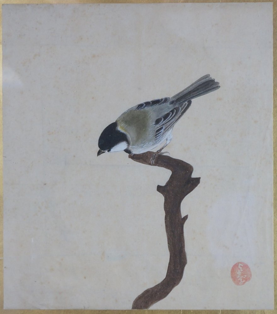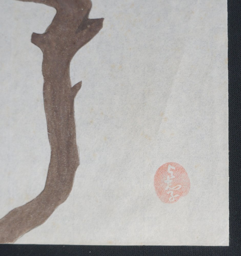 Minimalist Japanese bird watercolor on paper, early spring season painting, Nice hand and detailed realism. Signed and sealed by Sanoko (さの子). Light wear from time and usage, good conditions.