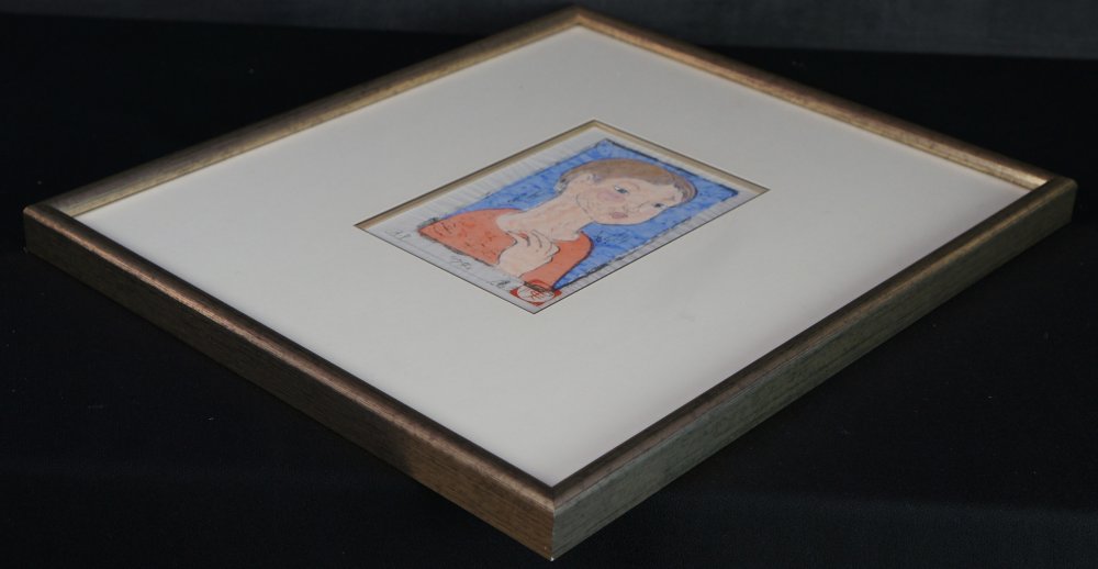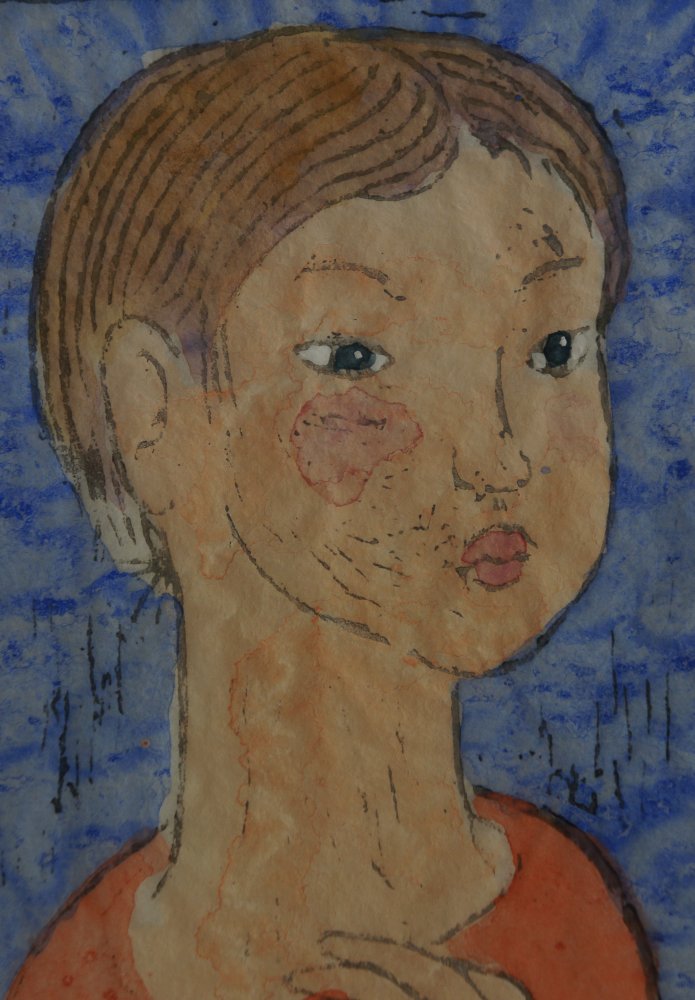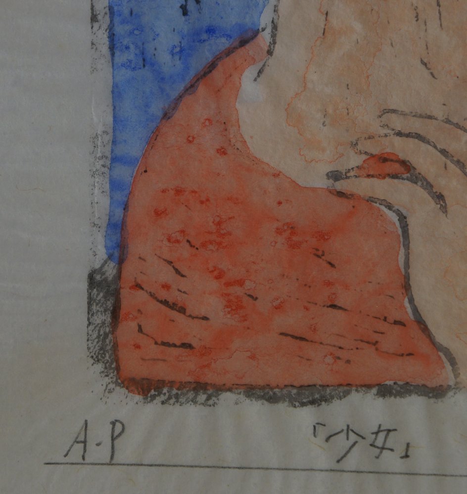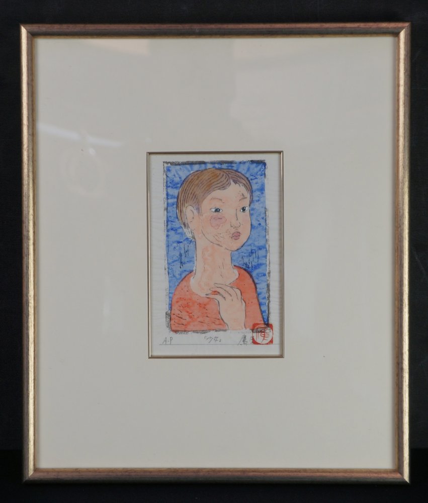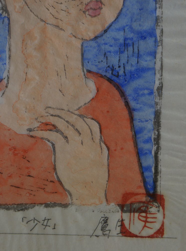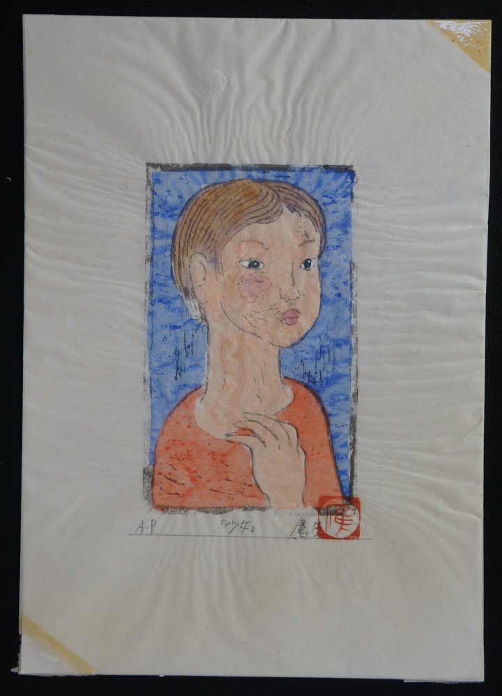 Japanese modernist master Takou 1960. Wood block print and watercolor techinque title small girl (少女) signed with pencile Takao (鷹生) Sōsaku-hanga current, watercolored Mokuhanga technique. Very nice small portrait on very fine washi paper.