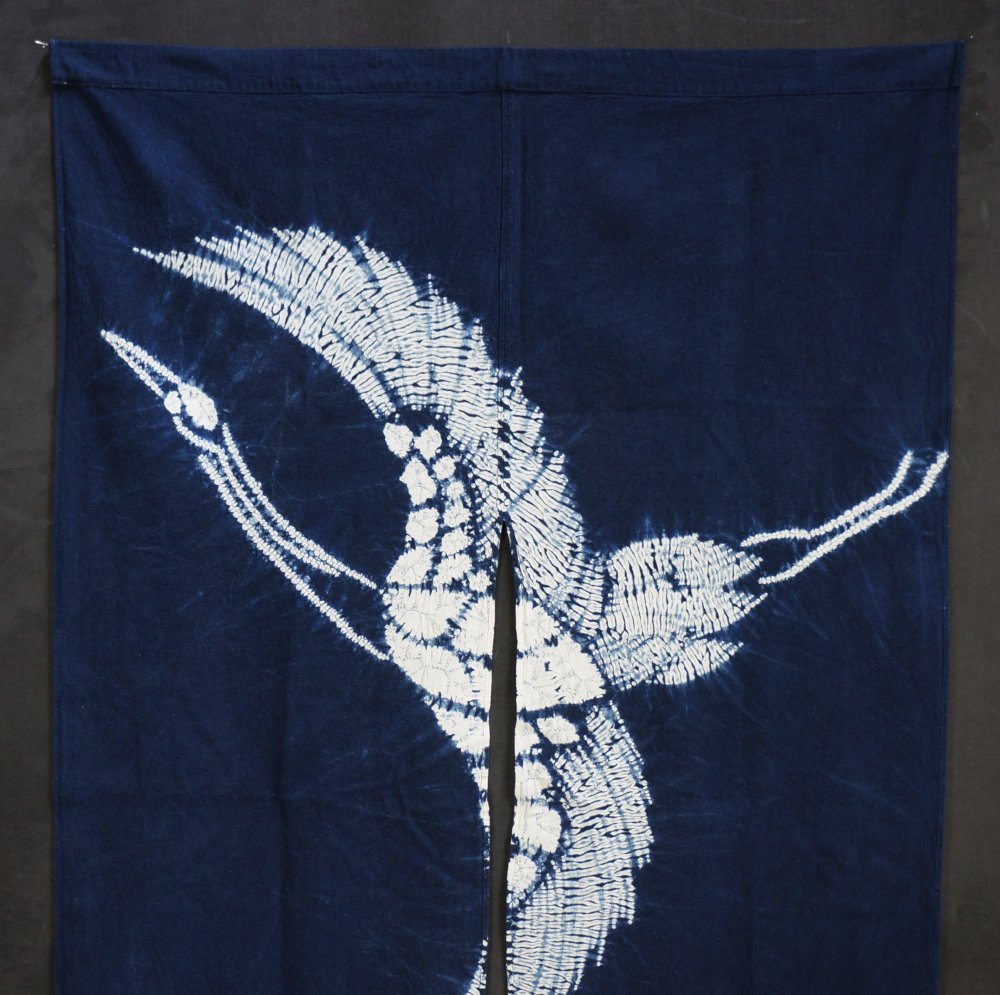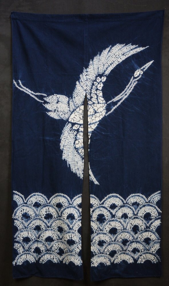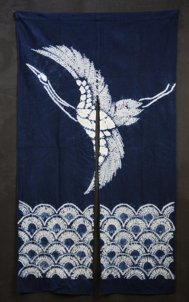 Hand made Japanese Noren curtain Takayama blue dye cotton decorated with Tsuru bird over waves. Niche character, good conditions, light wear marks from usage, Japan interior.