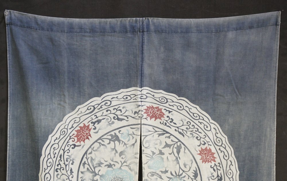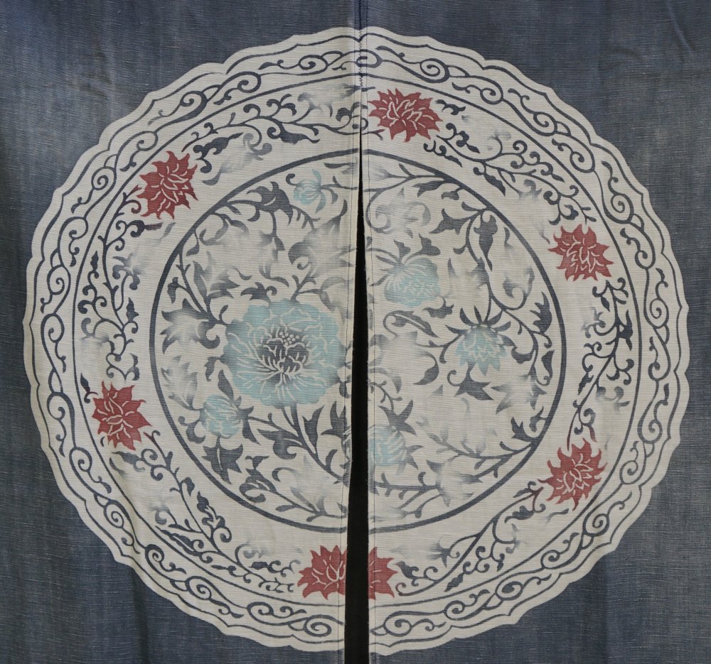 Hand made Japanese Noren curtain Takayama blue dye cotton decorated with mirror dish symbol. Niche character, medium good conditions, some wear marks from usage, Japan interior.