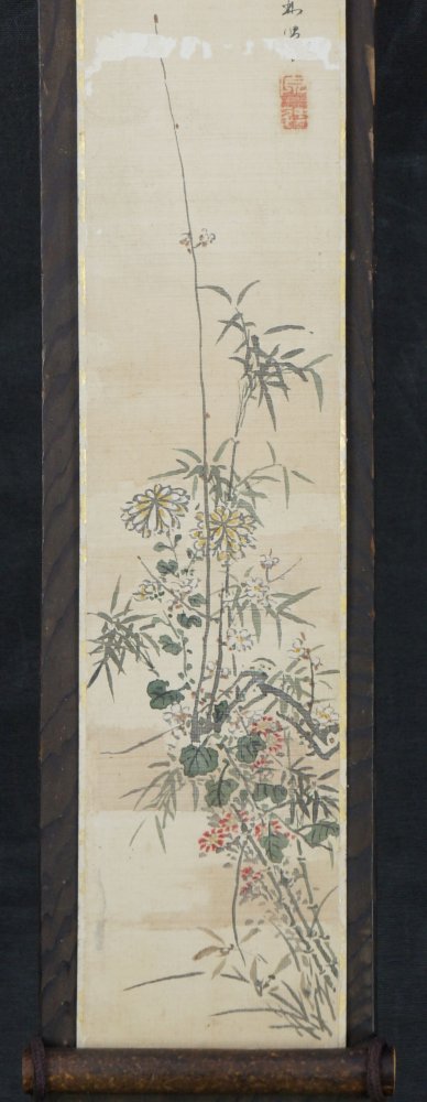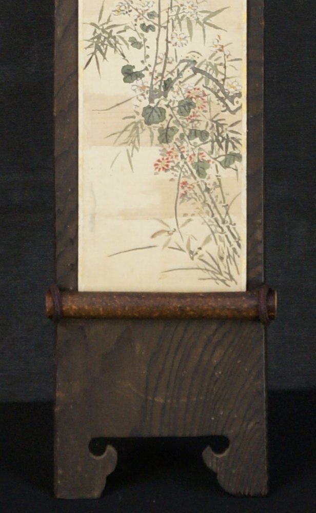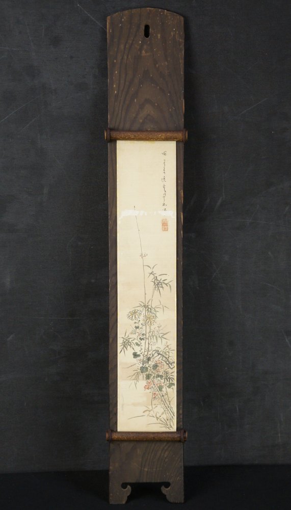 Japan Minimalist Zen wall art vertical Tanzaku holder floral motif, watercolor techinque on paper. Simple wood panel, simple rope and bamboo for Tanzaku holder. Tanzaku watercolor painting on paper technique. Well preserved with some wear marks from usage and time. Japan Wabisabi.
