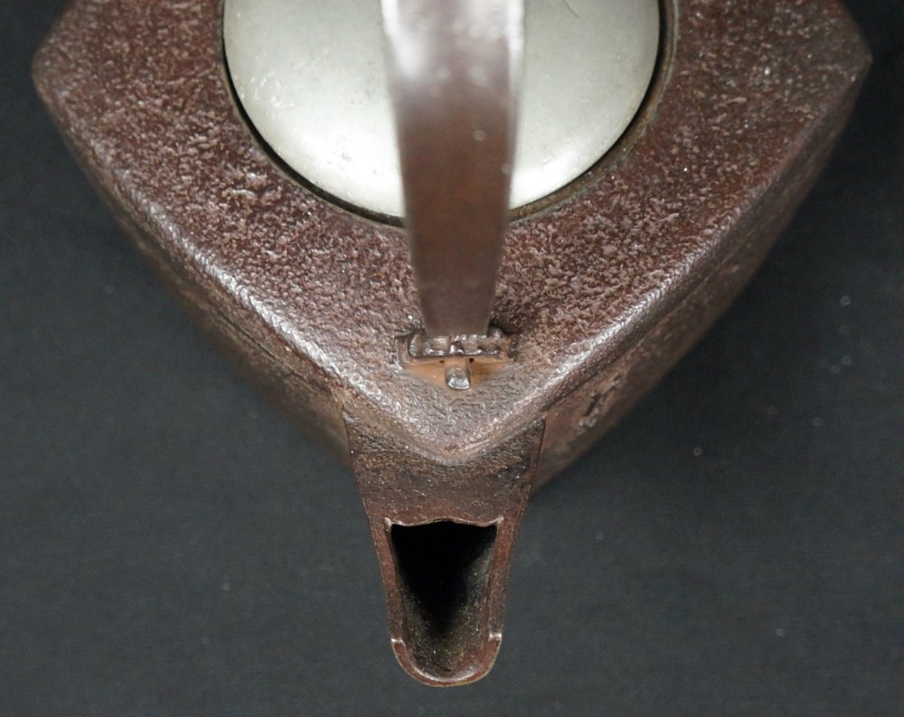 Nice sand cast iron Kettle Tetsubin water boiler with pewter lid. Nice conditions and shape, light wear marks from usage, no leaks, lid seems to be from an older Kettle. Makers name by spout. Immediately usable.