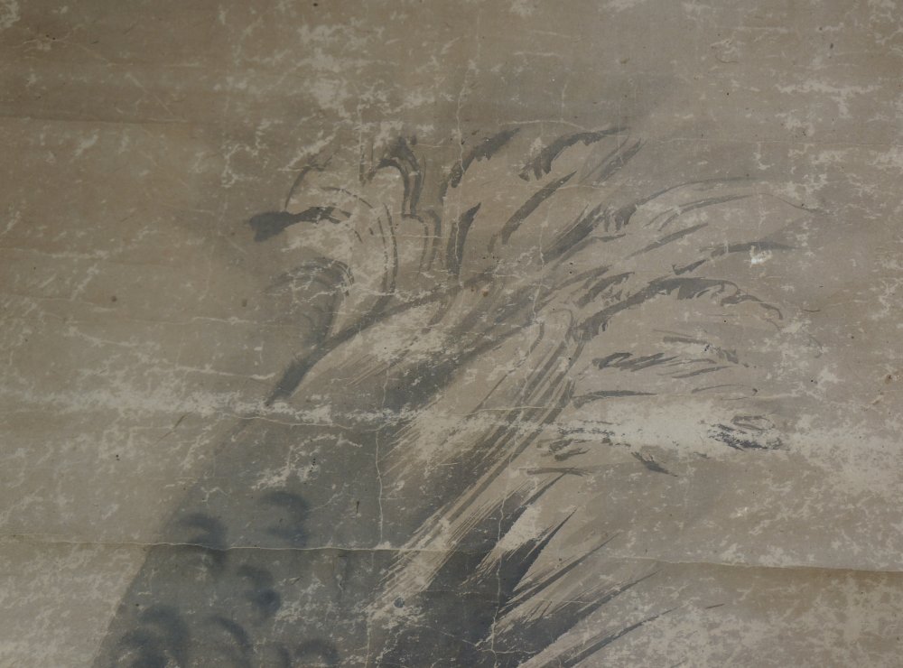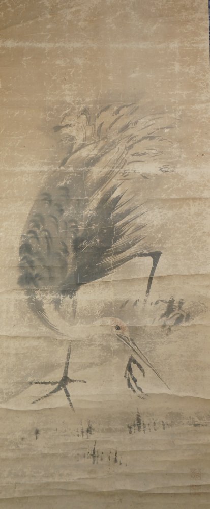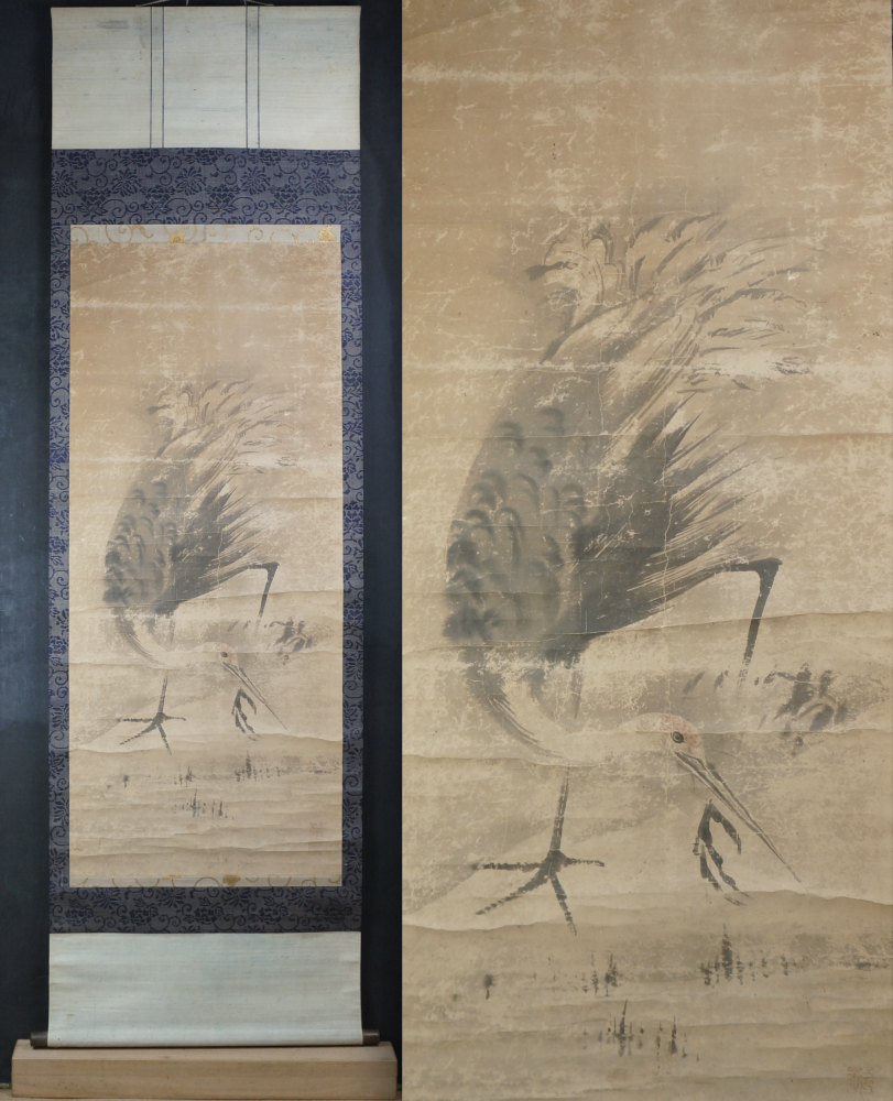 Fine antique Japanese scroll Tsuru bird, allegory of longevity and endurance. Sumi-e ink and watercolor on paper technique from early - mid Edo era, nice details and patina. Artist seal visible on lower side  Buncho school. Good conditions, ware on paper surface from time and exposure, professional restoration in early 1900. Immediately usable with protective wood box.
