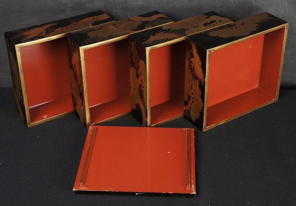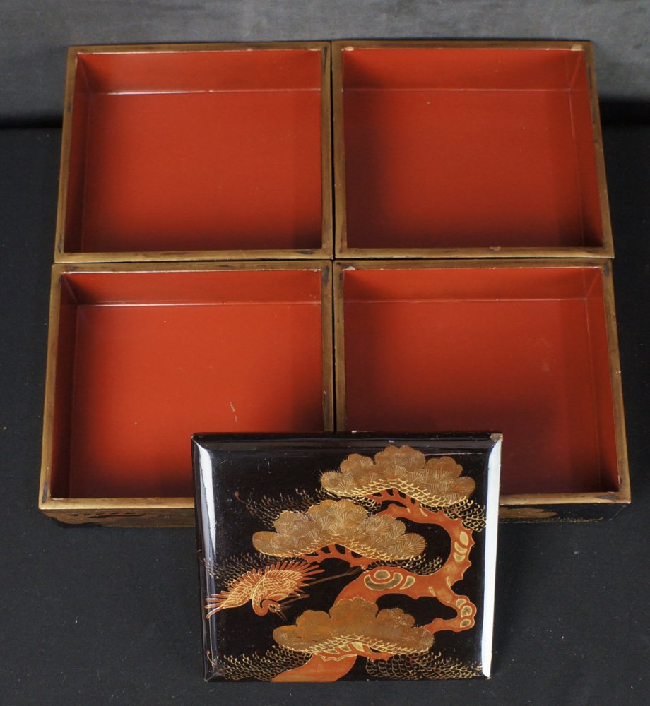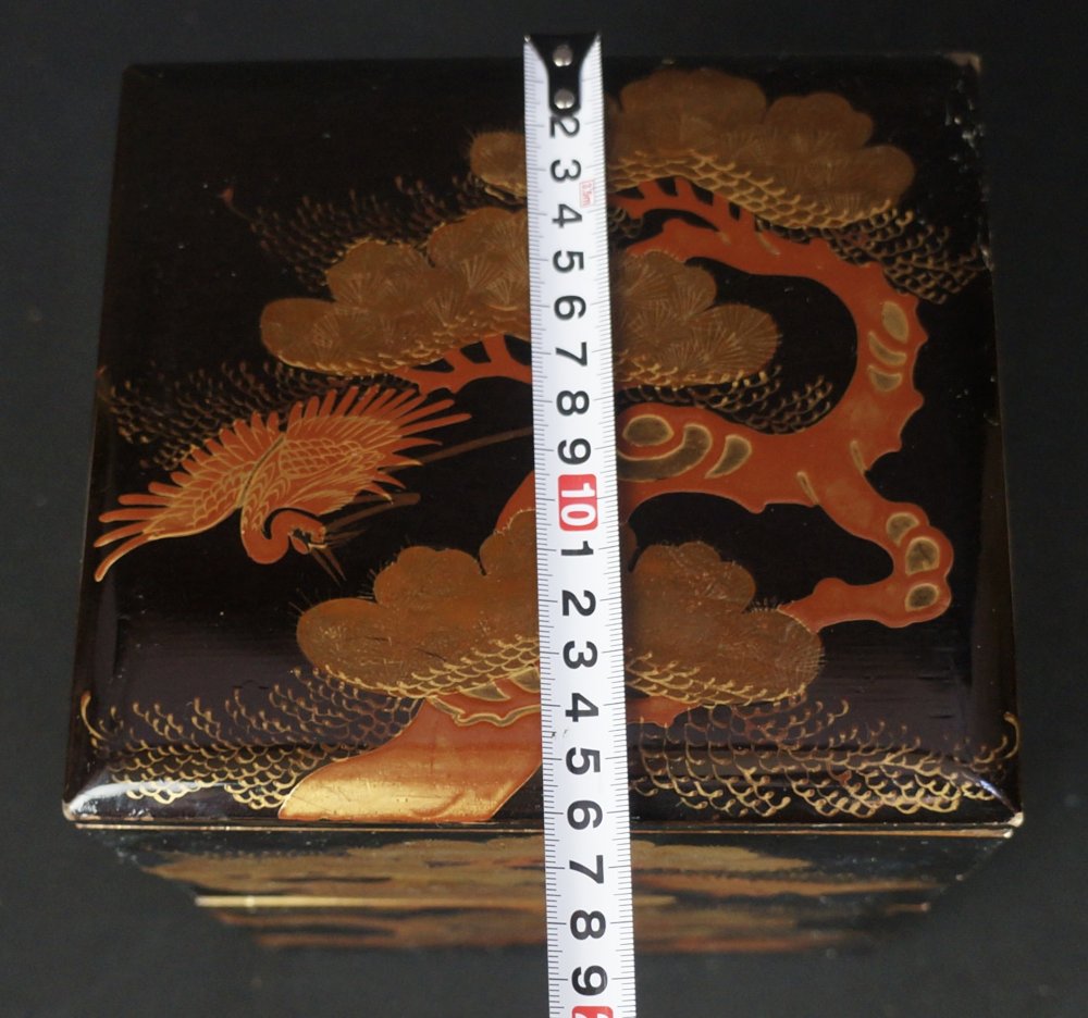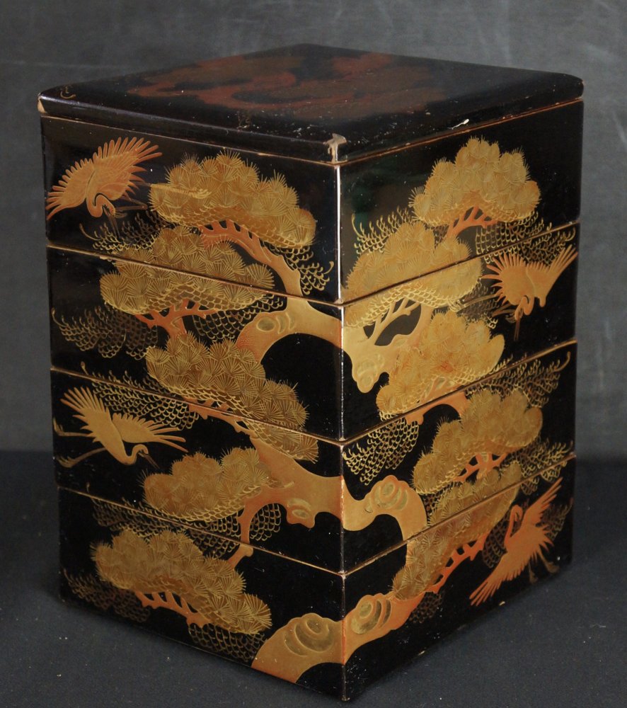 Antique Japan lacquer Tsuru birds Bento Jyubako food box 1800 Wajima.