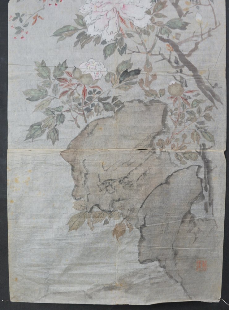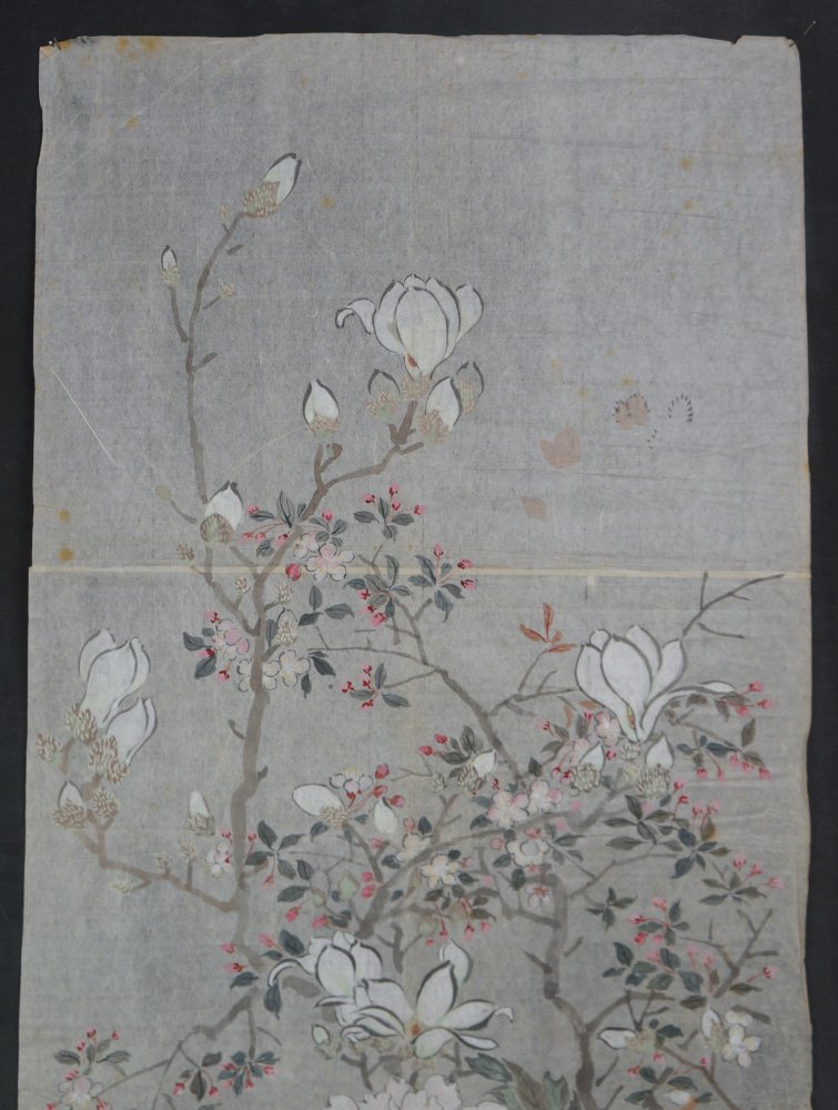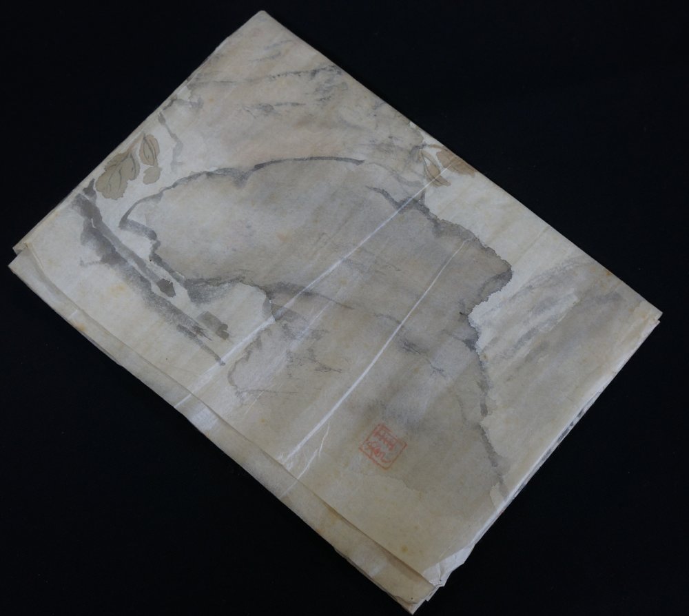 Antique Japanese wild flowers sketch on paper, Sumi-e and watercolor technique on Washi paper, part of a sketch collection by Renzan Takaharu (連山孝治). Medium good conditions, some wear from time and usage. Immediately usable in its original conditions and folds.