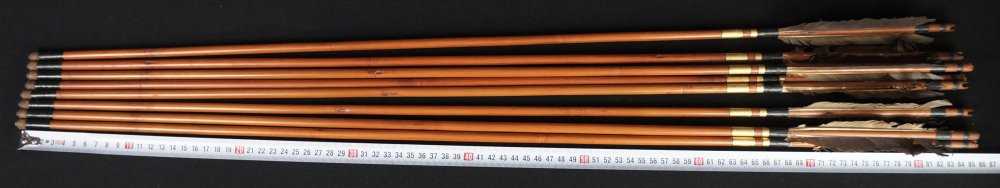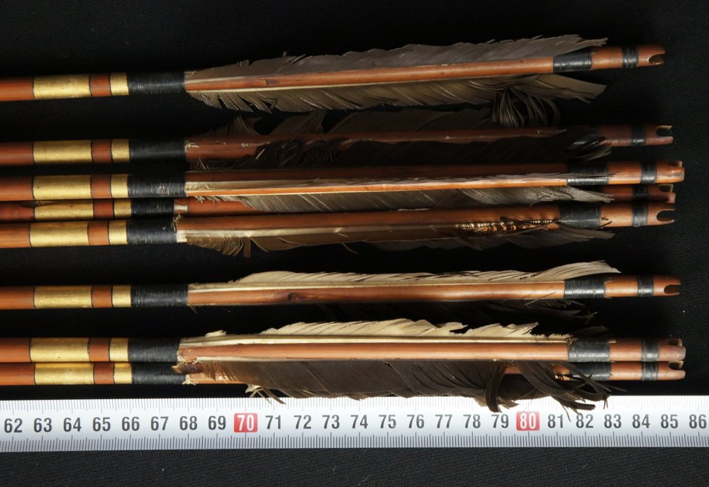 Japanese Ya arrow set of 8, hand made from bamboo shaft and feathers. Medium conditions, wear from time and usage, some missing feathers, to be used as antique/vintage item, fine Japanese craft.